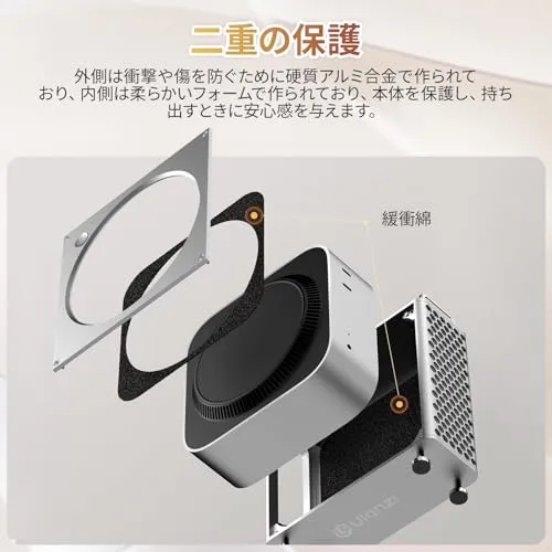 【アルミニウムケース】デザインは機械的なメタル感があり、ミニ Pro のようになります。外部は硬質のアルミニウムで、ぶつけや擦れに強く、日常使用に耐えます。内部には柔らかいポーラスフォームがあり、機器を保護し、持ち運びも安心です。縦置き式のデザインで、電源やポート操作が手元で簡単にできます。卓上スペースを有効活用し、作業環境を整え、作業効率を高めます。