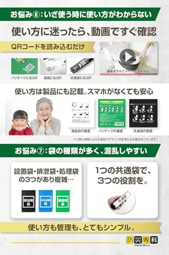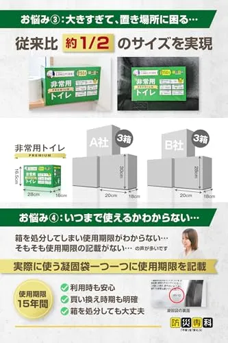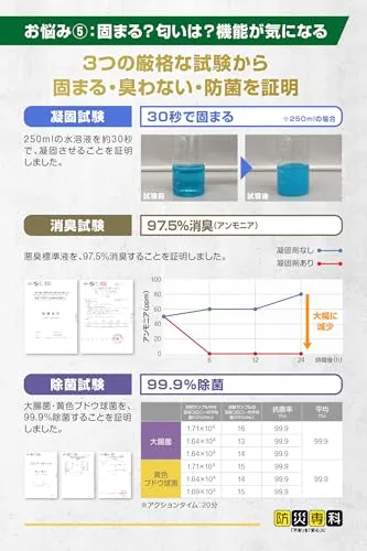 【15年保存・厳格な試験をクリアした高品質】長期保管に対応し、「菌を増やさない・臭わない・しっかり固まる」などの厳しい品質試験を一つひとつ通過した凝固剤を採用。大人も子どもも、男性も女性も、大便・小便を問わずご使用いただけます。