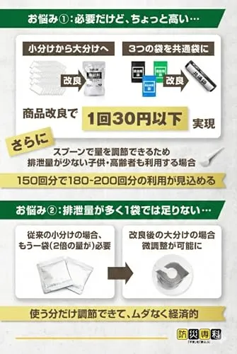 【手頃な価格でしっかり備えられる】被災時にもっとも困るトイレ問題。「必要なのに高い」という声に応え、容量をアップするとともに、使いやすさも改善し、コストパフォーマンスを高めました。