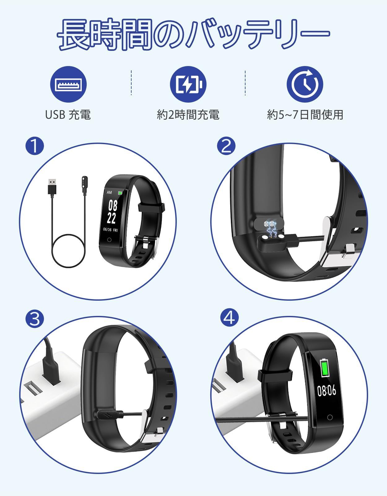 【長時間使用可能】90mAhのバッテリーで、通常使用で3-5日、30日間待機できます。頻繁に充電する必要はありません。