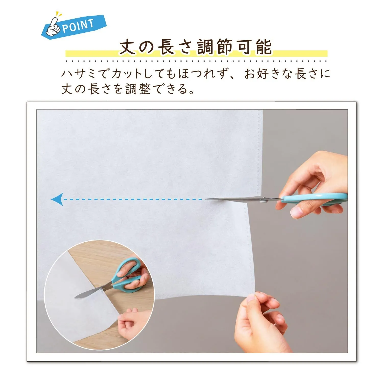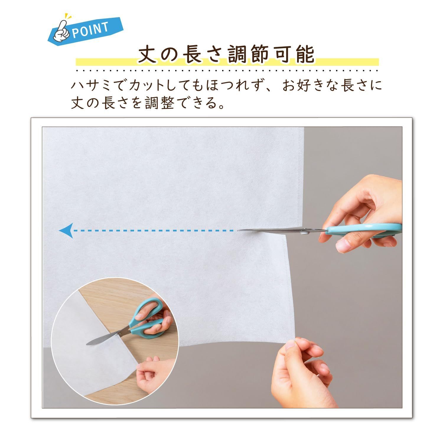 ●裾をハサミで自由にカットすることもできるので、洋服の長さに合わせて使える。