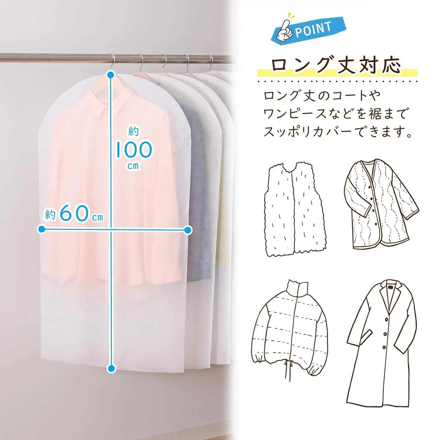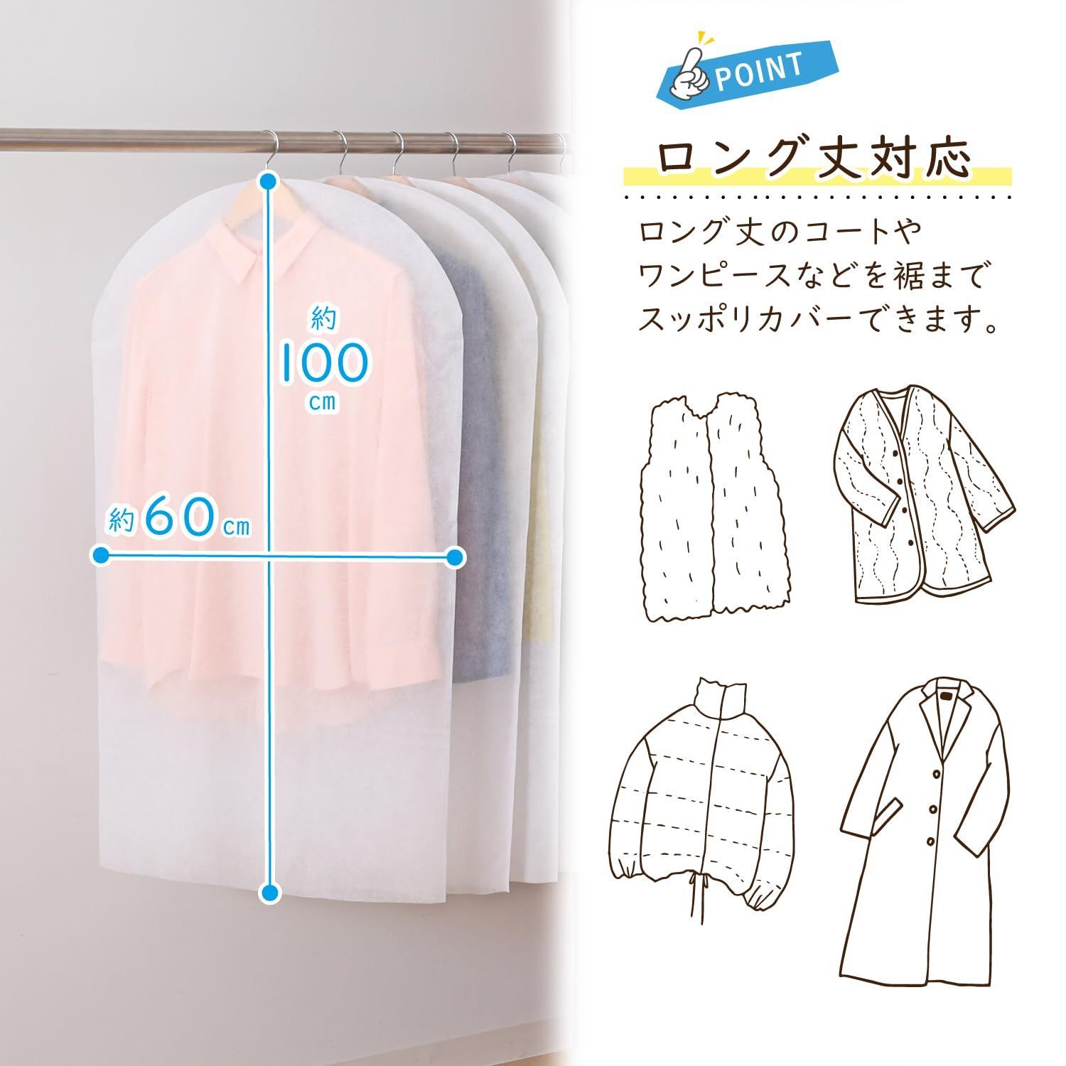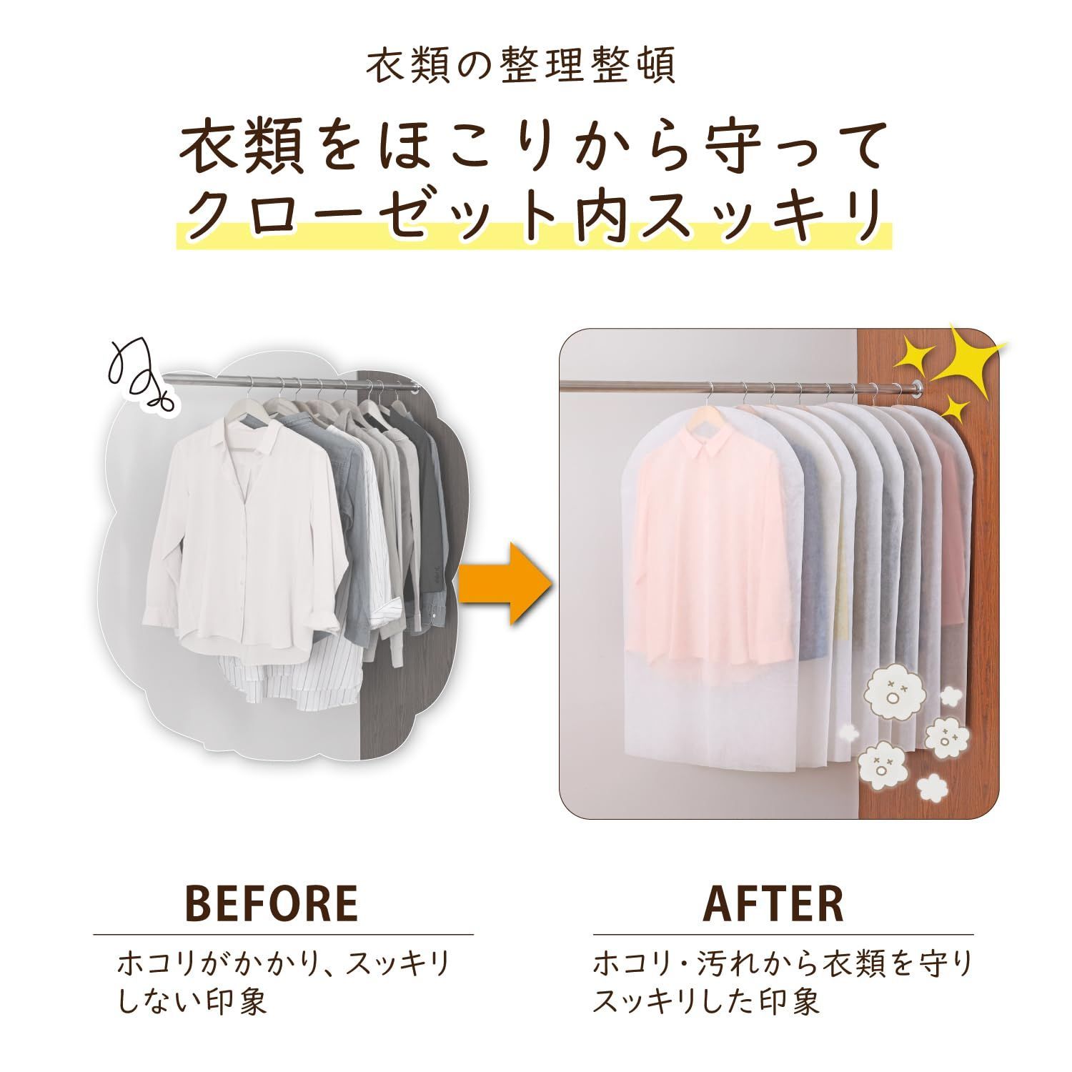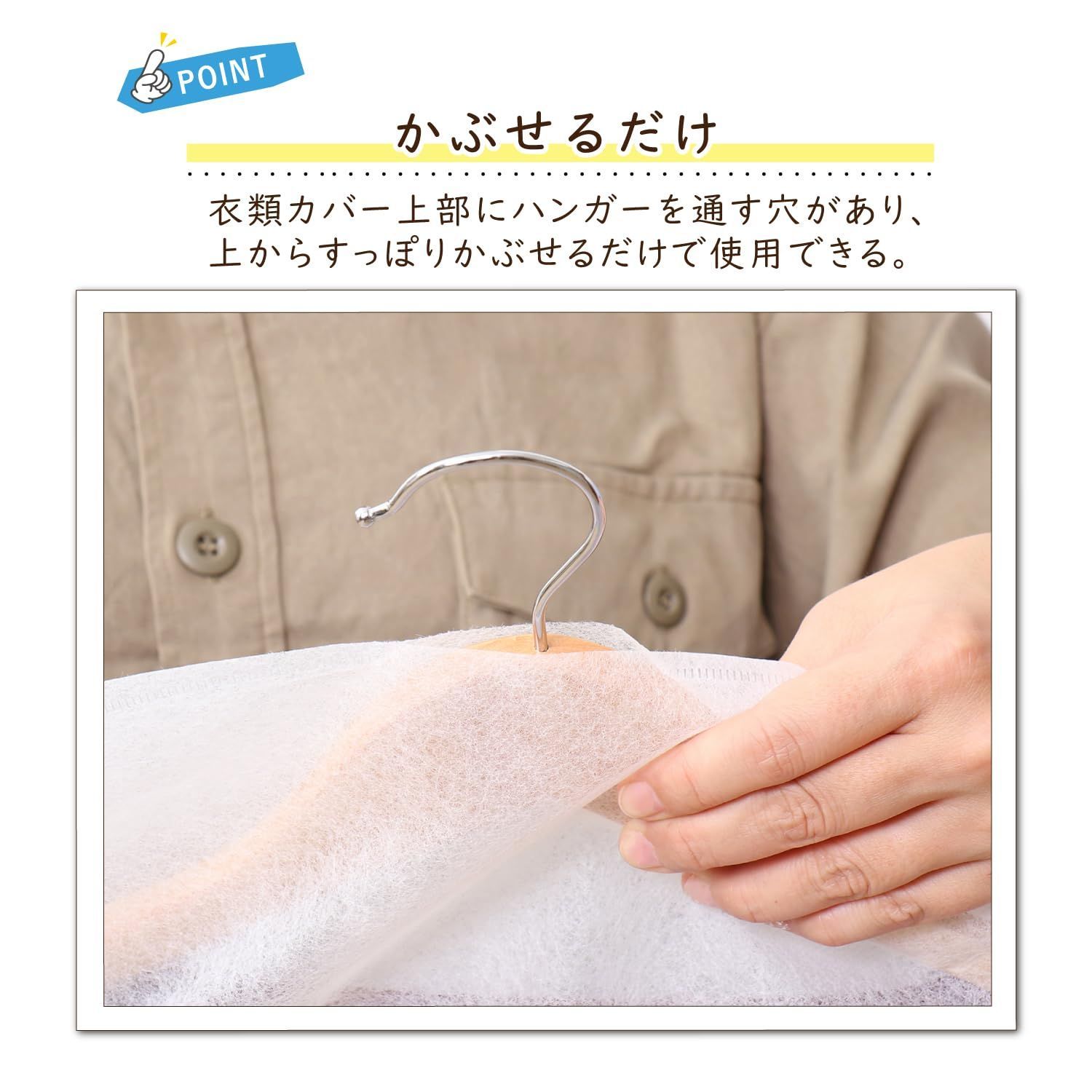 【上からかぶせるだけ・衣類のほこり除けに】:ハンガーに掛けた洋服の上からかぶせるだけ。オフシーズンの衣類のほこり除けに。