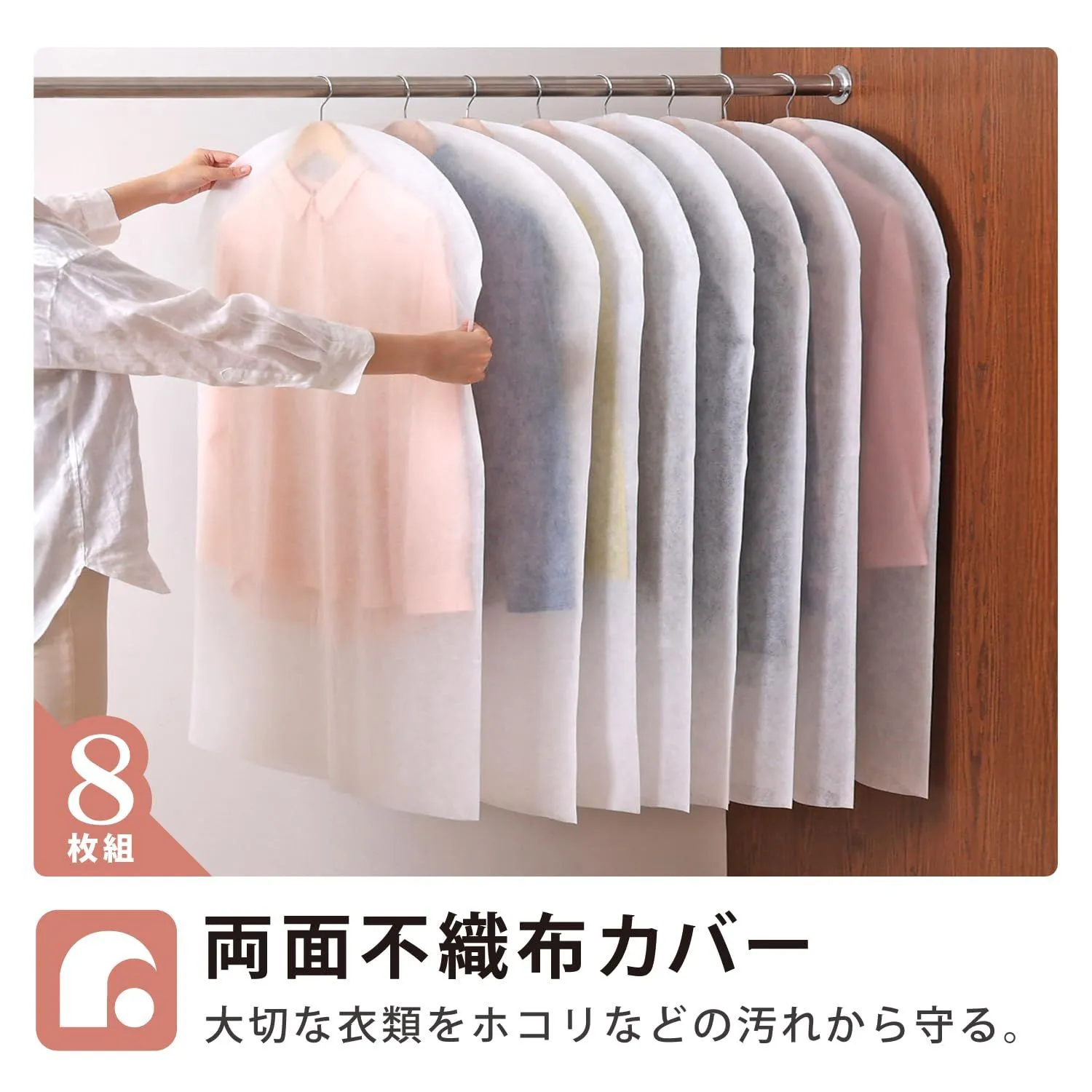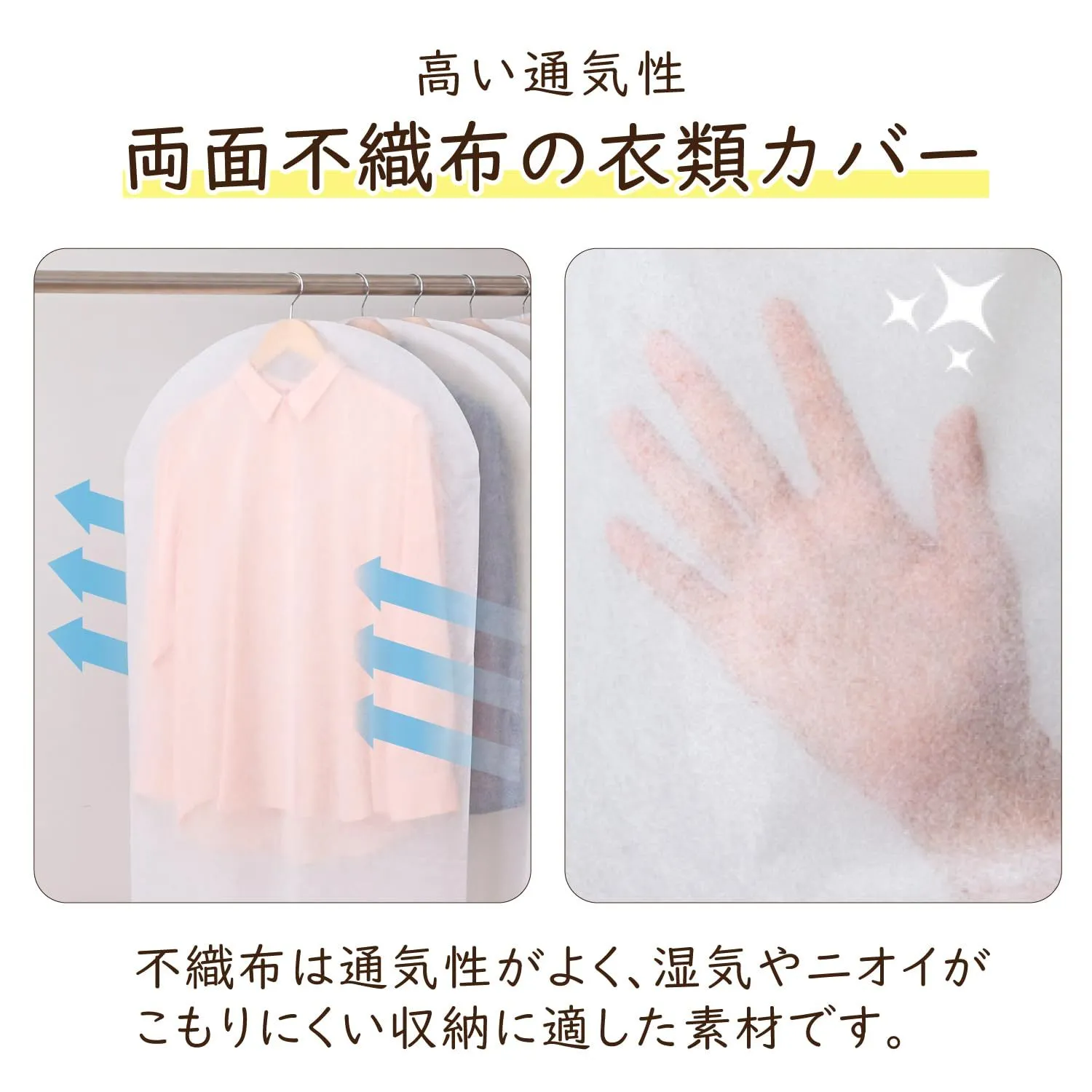 【通気性に優れた両面不織布製の衣類カバー】:湿気やにおいがこもりにくい、通気性の良い不織布製のショートサイズの衣類カバー。