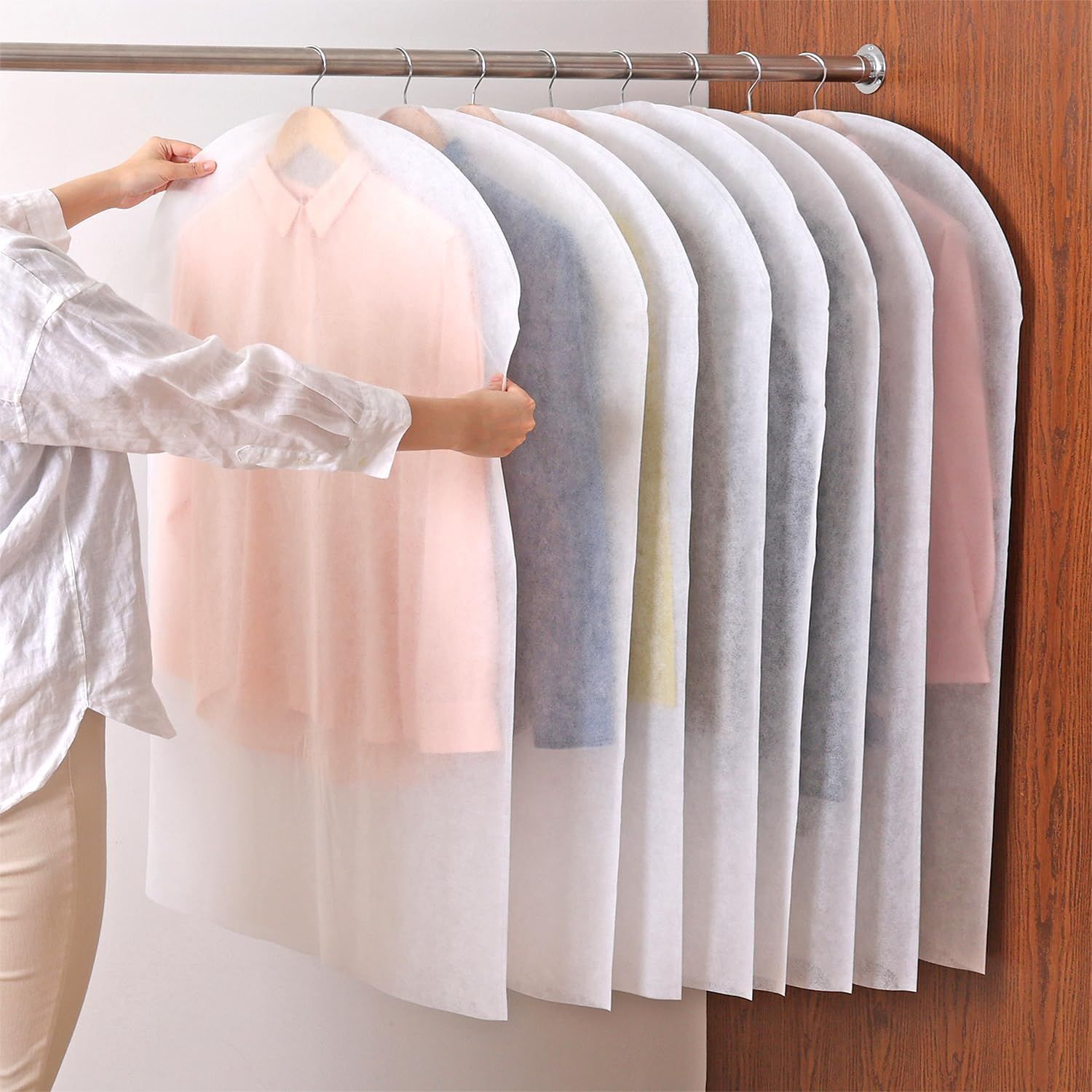 【毛玉や生地の傷みなどのダメージ防止にも】:1枚ずつカバーを掛けておくことで洋服同士が擦れず、毛玉や生地の傷み防止にも。