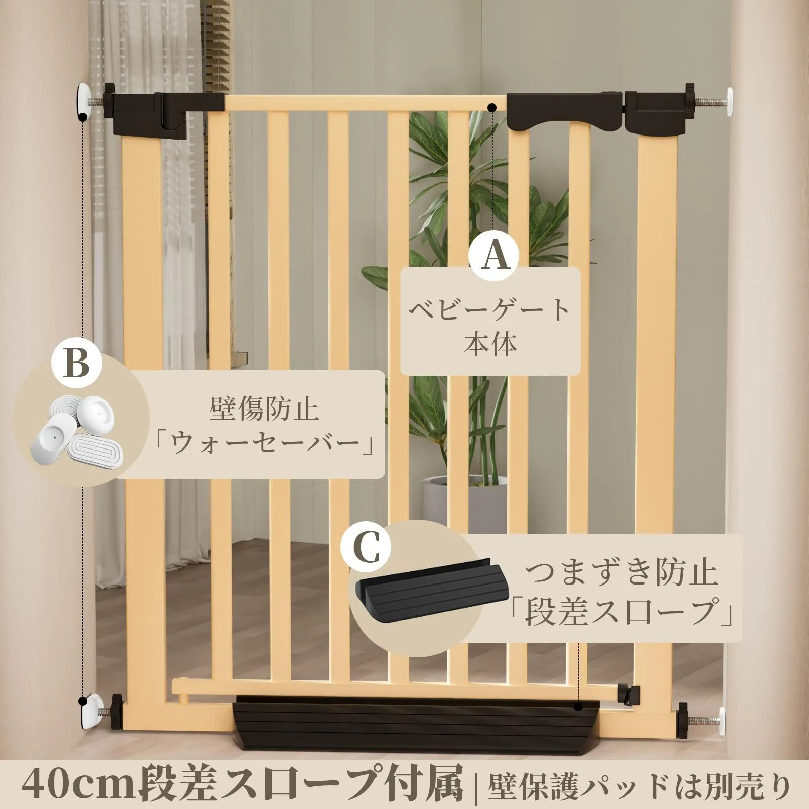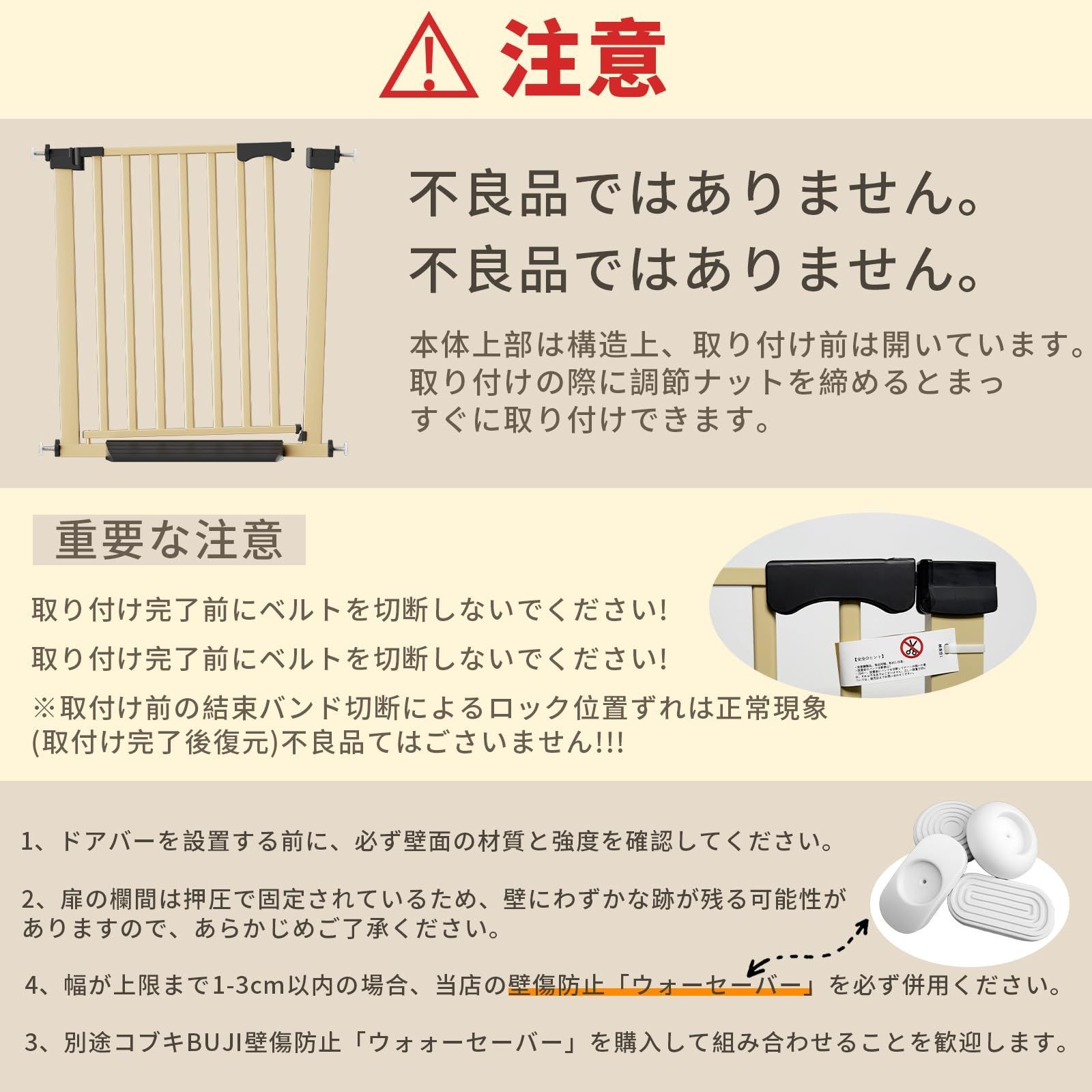 【取り付け幅に関する安全上のご注意】 本製品にはそれぞれ対応する取り付け幅の範囲がございます。お取り付け予定の幅が、その範囲の最大値付近(最大値まであと1~3cm以内)である場合、安定した固定と安全性を確保するため、当店別売りの壁傷防止「ウォーセーバー」の併用を強くお勧めします。本体のみの圧力固定では、限界に近い幅でずれたり外れたりするリスクがあります。お子様の安全のため、ぜひご検討ください。