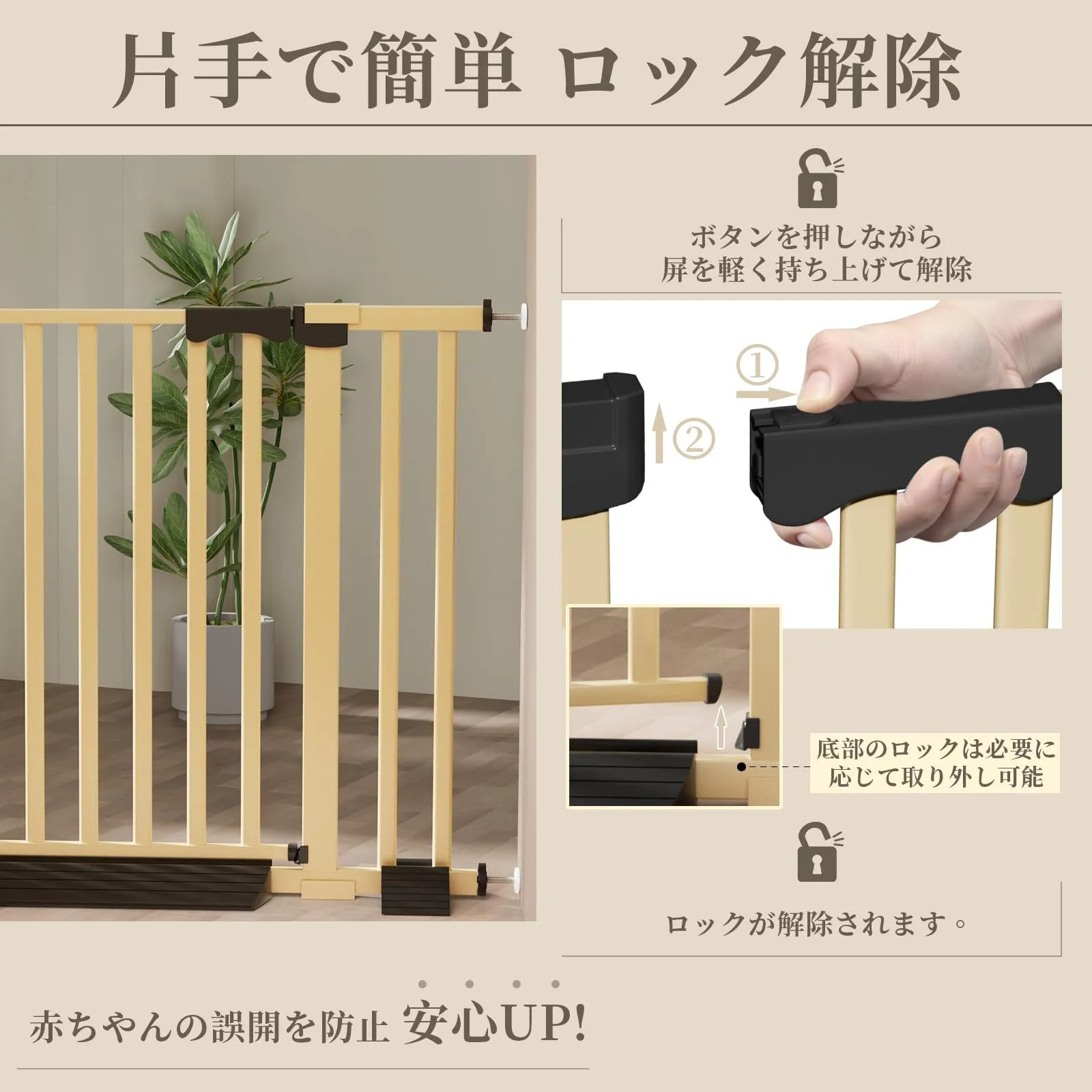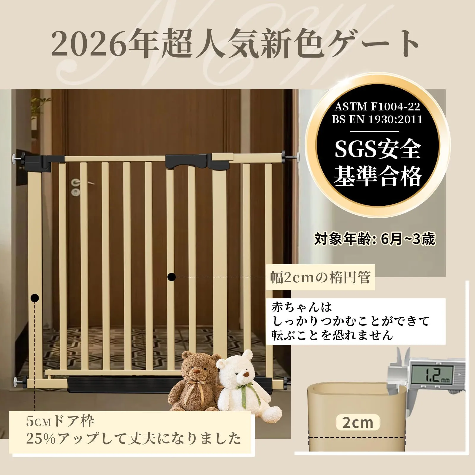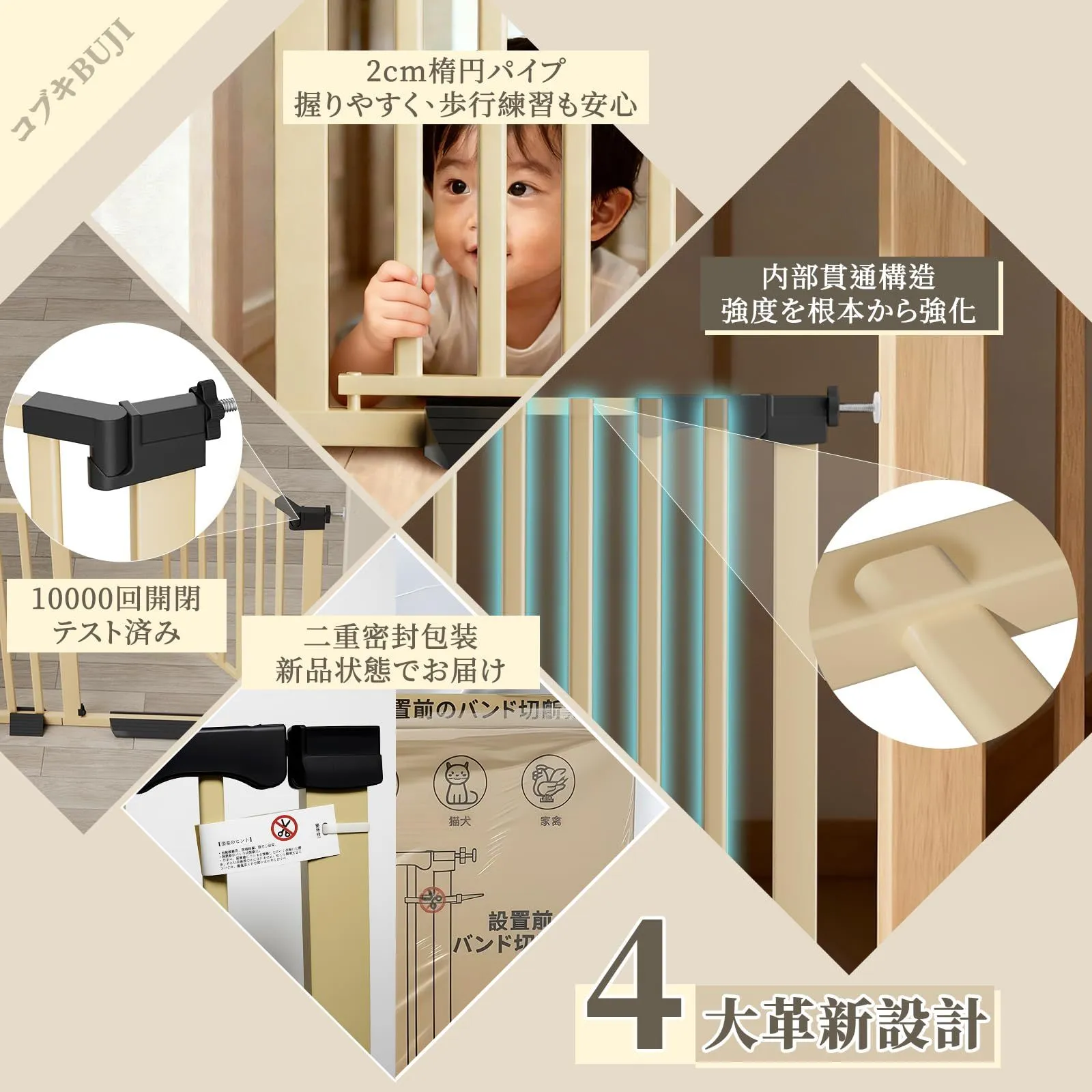 【2cm楕円バー&5.5cm密間隔+伸管構造:毎日の安全を支える強化設計】 従来の細い丸パイプ(約1cm)から、握りやすい2cm楕円バーにアップグレード。バー間隔も5.5cmの密設計。さらに、バーが上下の横杆に食い込む「伸管構造」(表面溶接ではなく内部固定)で、ペットや子供の衝撃にも強く長持ち。上下連動ダブルロックで大人は片手操作、赤ちゃんの誤開けをしっかりブロック。ベビーゲートとしてもペットゲートとしても安心です。