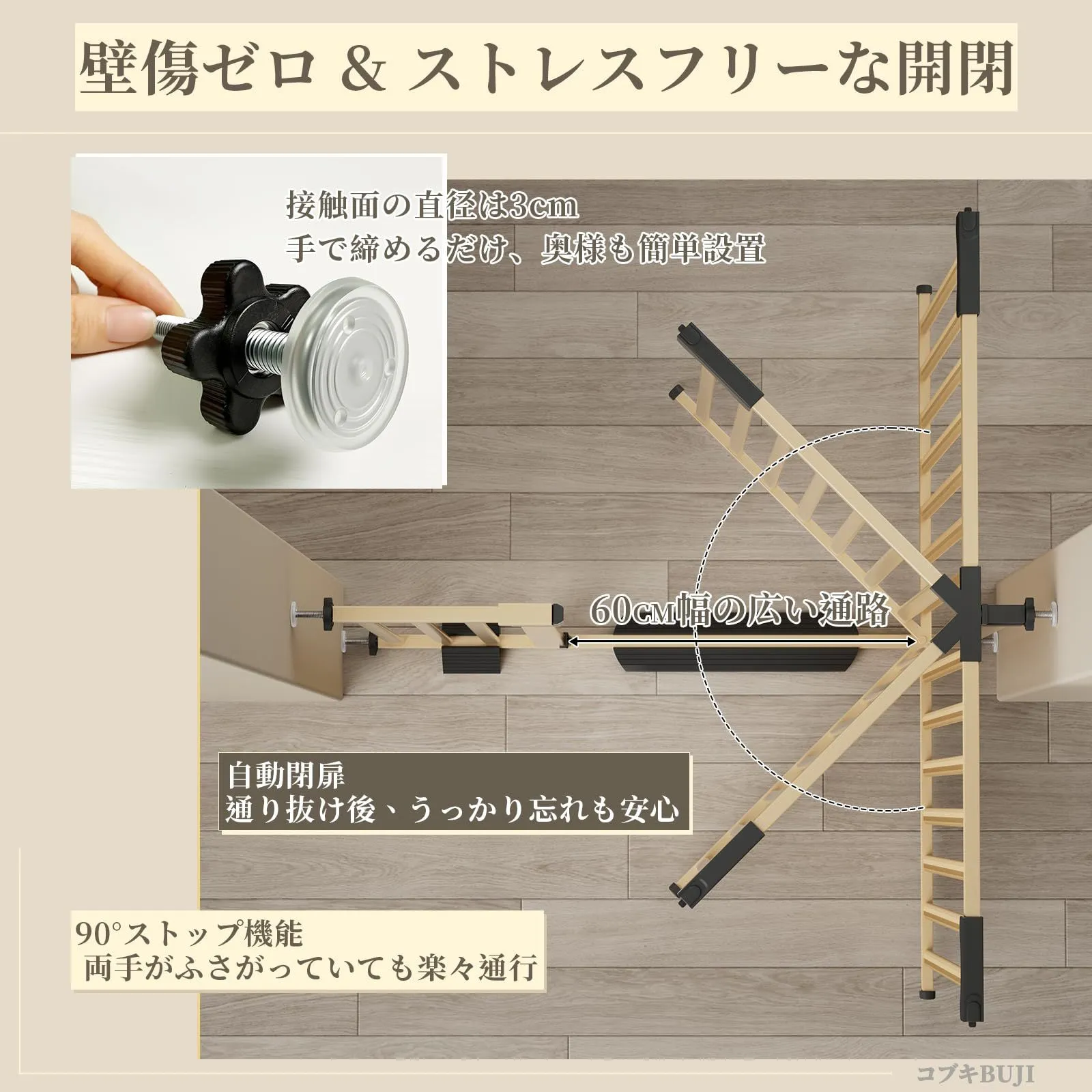 【76cm高:日常のあらゆるシーンに最適なベビー&ペット柵】 76cmの高さは、赤ちゃんやよちよち歩きの子供の転落防止にぴったり。小型犬から大型犬、猫までペットの脱走防止柵としても活躍。23歳の手先が器用な子供にはコブキBUJIのハイタイプ(105cm)を推奨。幼いペットがいるご家庭は3.5cm間隔の加密款がおすすめ。突っ張り式だから賃貸も安心。階段・キッチン・玄関・室内どこでも使える、でも高評価のコブキBUJI製品です。