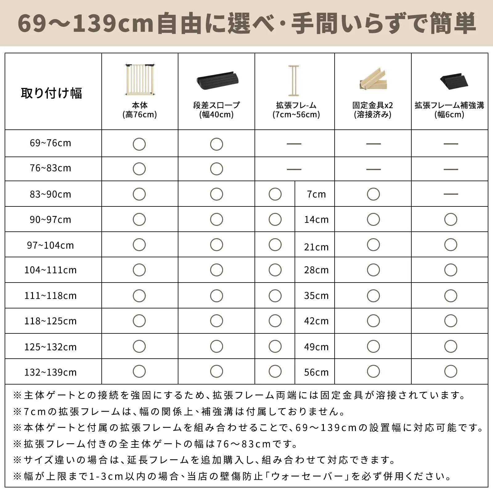【新色ウッドカラー&幅69139cmまで自由調整】 お部屋のインテリアに溶け込む温かみのあるウッドカラー(単一のライトブラウン)。玄関・階段・キッチンはもちろん、リビングや廊下まで幅広く使えるフェンス・柵として活躍。ゲート本体(幅6976/7683cm)に拡張フレーム(756cm)を組み合わせて69cmから139cmまで自在に調整可能(83cm以上で拡張フレーム付き)。全サイズに防蹴りパッド(40cm)付属。壁傷防止パッドとY型ボルトは別売で、突っ張り式設置でも壁紙保護・柱状階段に対応。