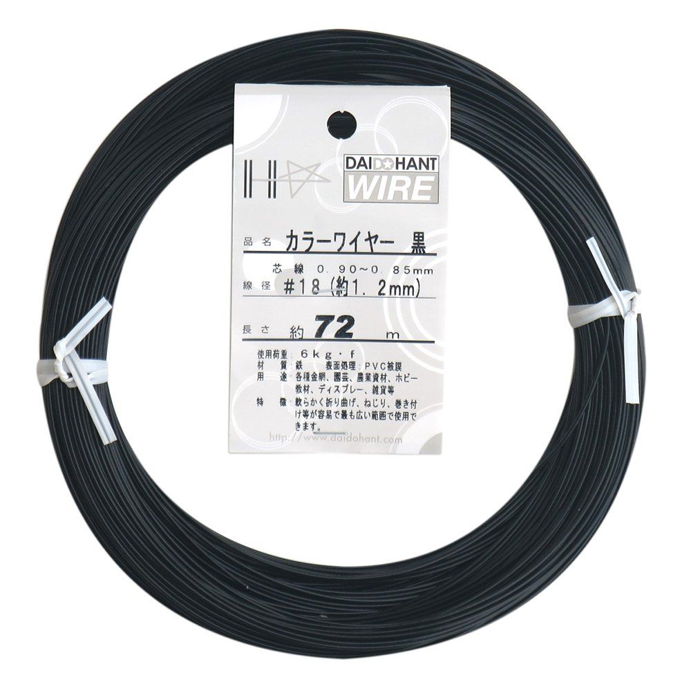 安全耐荷重:6kgf。なまし鉄線にPVC(ポリ塩化ビニール)を被膜した針金です。
