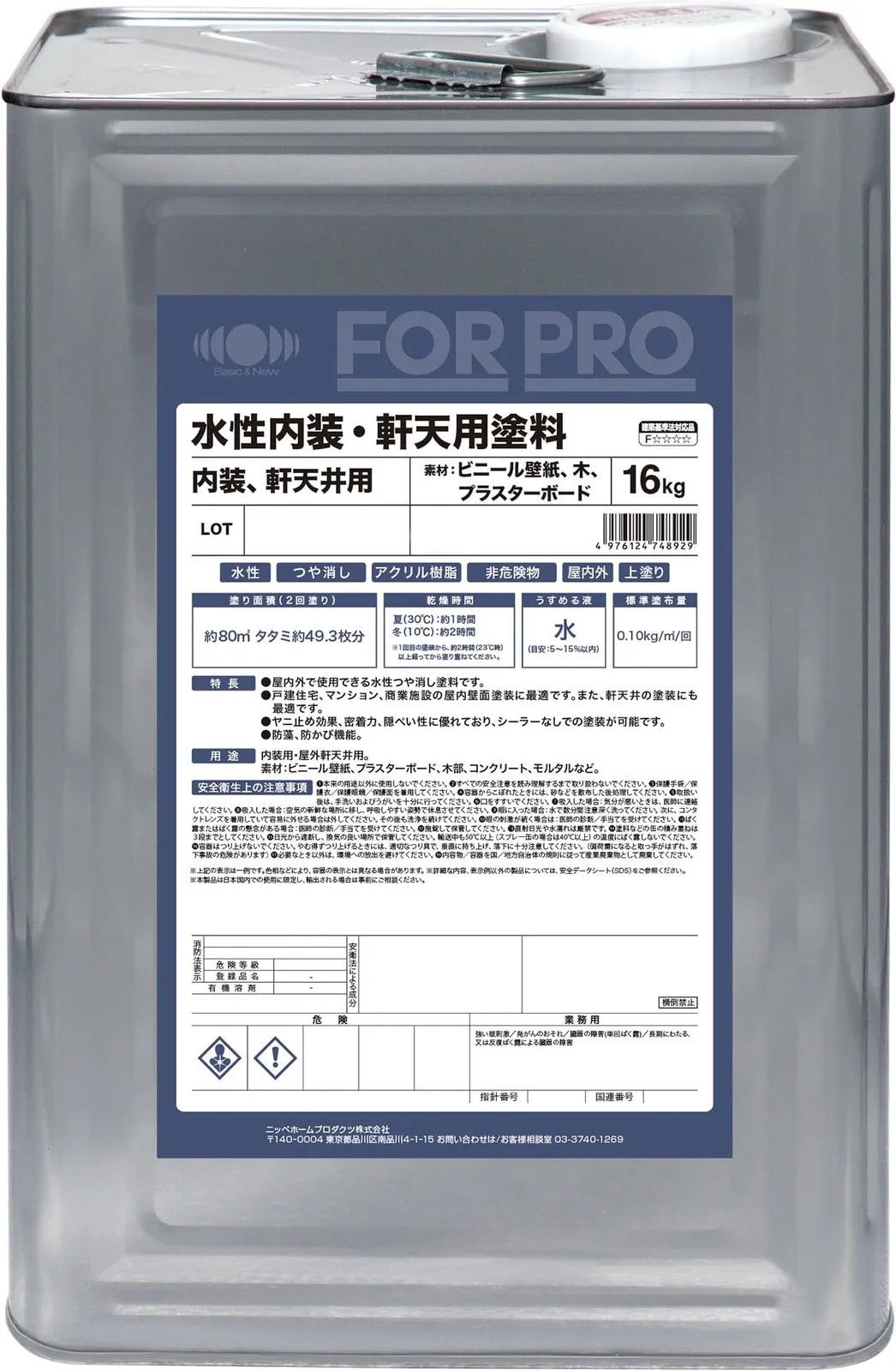 屋内外で使用できる水性つや消し塗料です。 戸建住宅、マンション、商業施設の屋内壁面塗装に最適です。また、軒天井の塗装にも最適です。 ヤニ止め効果、密着力、隠ぺい性に優れており、シーラーなしでの塗装が可能です。 防藻、防かび機能。
