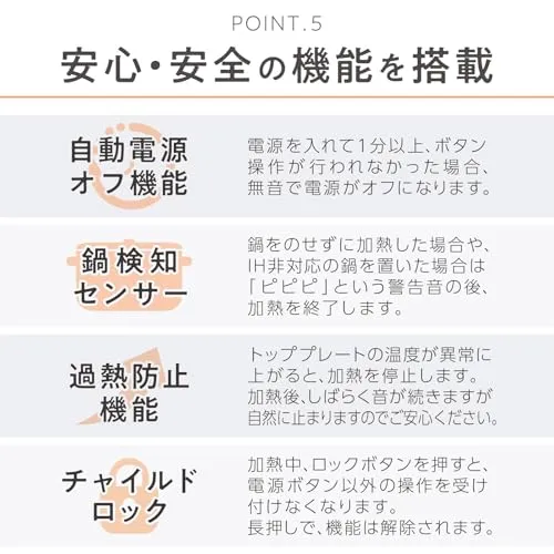 【もしものトラブルにも対応】自動電源オフ機能・鍋検知センサー・過熱防止機能・チャイルドロック搭載。