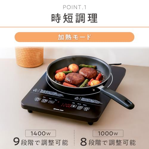 【最大1400Wの火力】9段階の強さで調理が可能、調理メニューに合わせて火力を細かく調整することが出来ます。