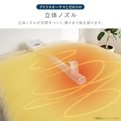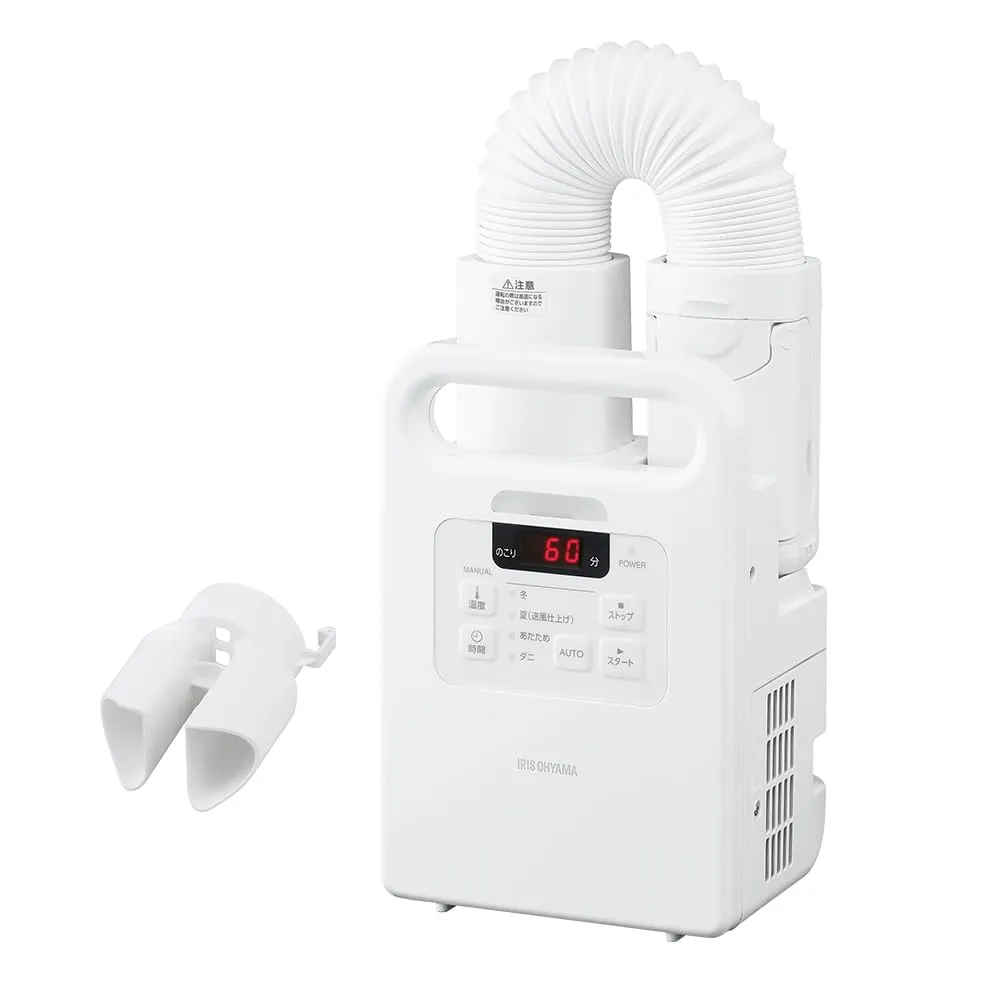 オールシーズン大活躍、アイリスオーヤマのふとん乾燥機。花粉、湿気や寝汗、ダニ、寒い夜に。冷えたふとんを一気にあたため、ふんわり仕上げる。