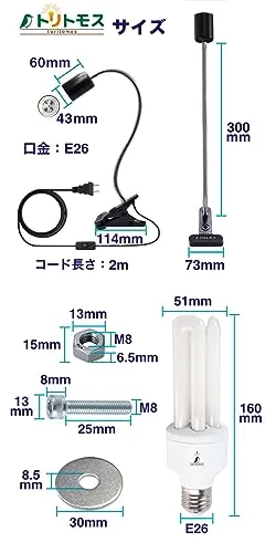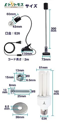 ご覧いただきありがとうございます 即購入OK! 丁寧な梱包・発送でお届けいたします。 よろしくお願い致します 定格電圧:AC100V 定格電力:20W 定格周波数:50/60Hz 定格ランプ電流:0.2A ランプ口金サイズ:E26 UVB含有率:2.4% 製品重量(本体ランプ) 414g セット内容:トリトモス本体・トリトモスランプ・取付金具2組・日本語マニュアル