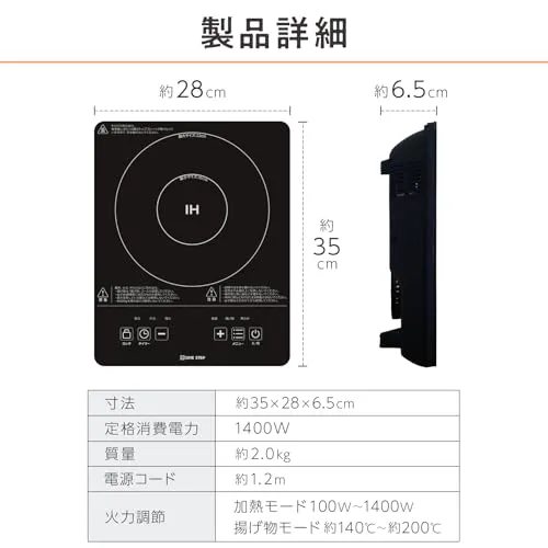 【製品詳細】サイズ:35286.5cm 消費電力:1400W 重量:約2kg 電源コード:約1.2m 火力調節:加熱モード801400W 揚げ物モード約140200