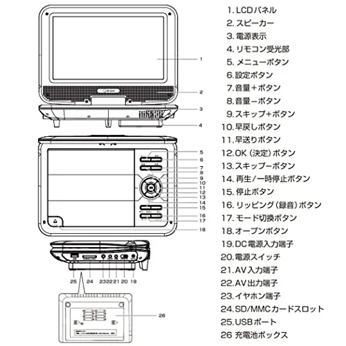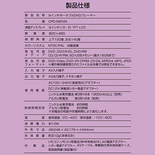【商品仕様?】本体サイズ:幅24.8奥行17.9高さ5.4cm 本体重量:約810g 液晶ディスプレイ:9インチ(16:9)TFT LCD 解像度:800480 視野角度:上下120度、左右140度 再生可能メディア:DVD、DVD-R/DL、DVD-RW、CD、CD-R/RW、SD/USBメモリー(最大16GBまで) 再生可能フォーマット:DVD-Video、DVD-VR CPRM、CD-DA、MPEG4、MP3、JPEG※著作権保護管理されたファイルは本機では再生できません。