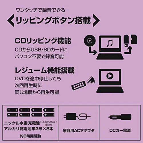 【便利な機能】CDからUSB/SDカードにパソコン不要でワンタッチ録音ができるCDリッピング機能搭載。また、DVDを途中停止しても次回再生時に同じ場面から再生が可能なレジューム機能も搭載しております。