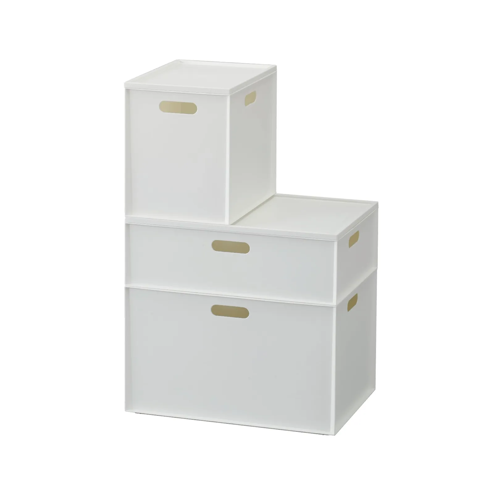 シリーズで組み合わせて他サイズともスタッキングできるため、スッキリ収納。トレーを使用すればフタ付き収納が可能です。