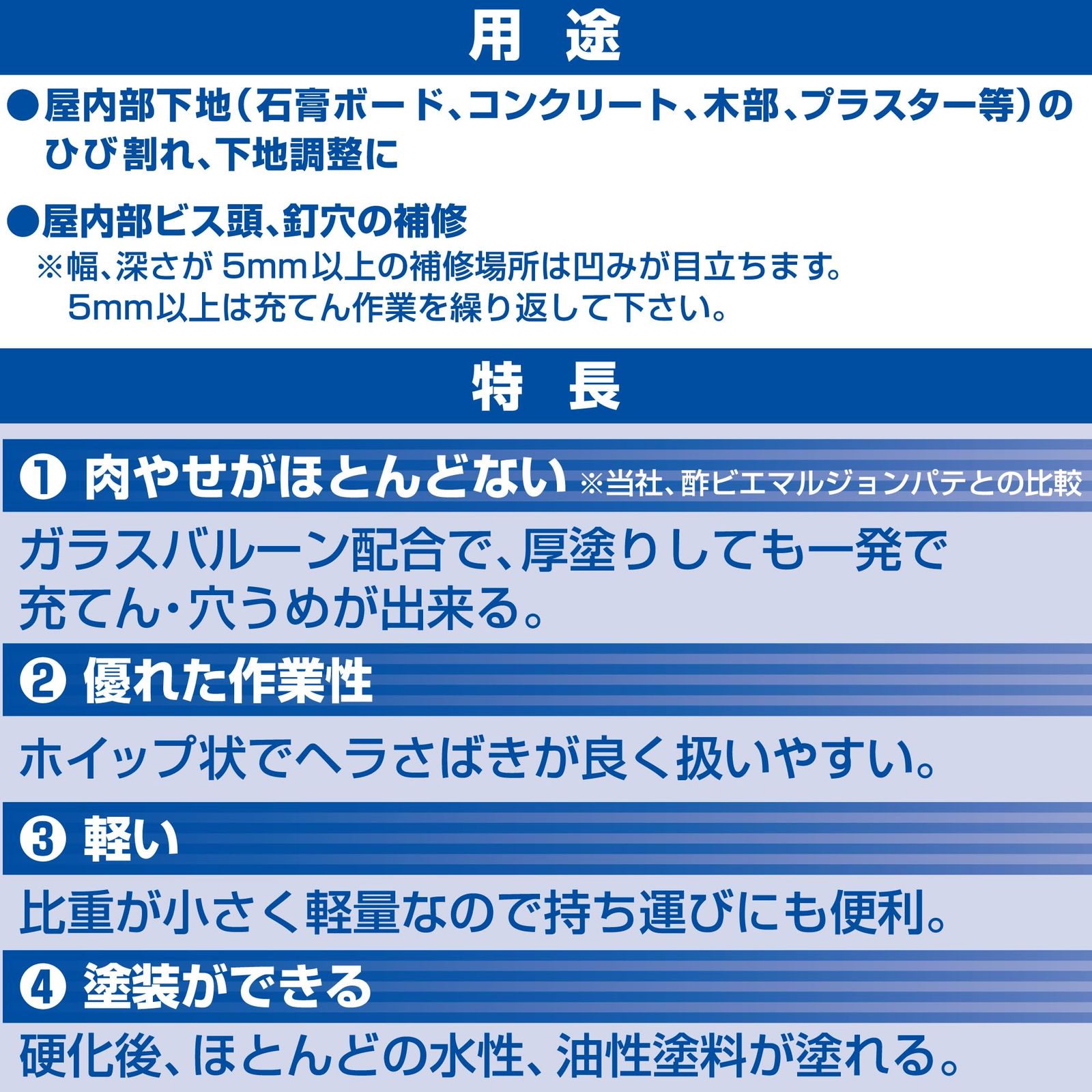 ●ホイップ状で使いやすい、比重の小さい軽量パテです。