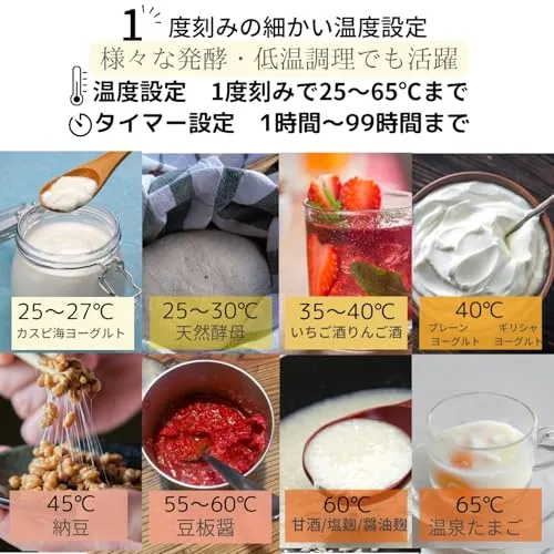精密な温度&タイマー設定 2565の1刻みの温度調整、199時間までのタイマーで、様々な発酵調理をお楽しみいただけます。