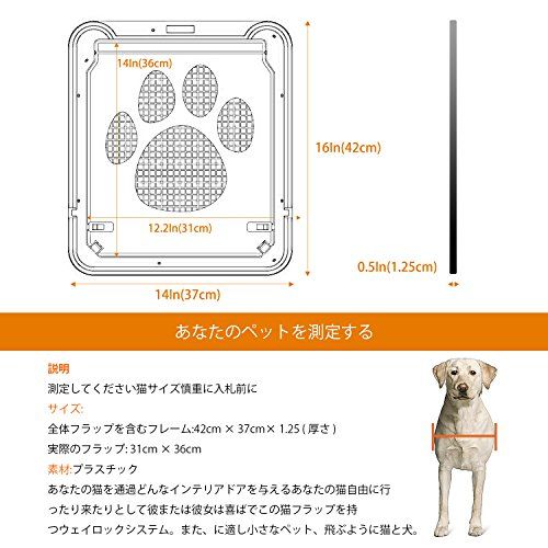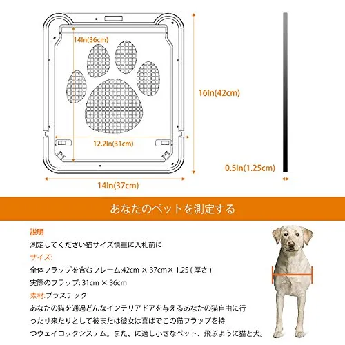 ほとんどのペットの理想的なサイズ:出入り口 31x36 cm、外枠 37x42 cm。大型犬、中型犬に適しています。常にペットの身長に合わせてインストールして、最適な使用効果を得ることができます。