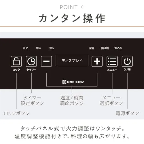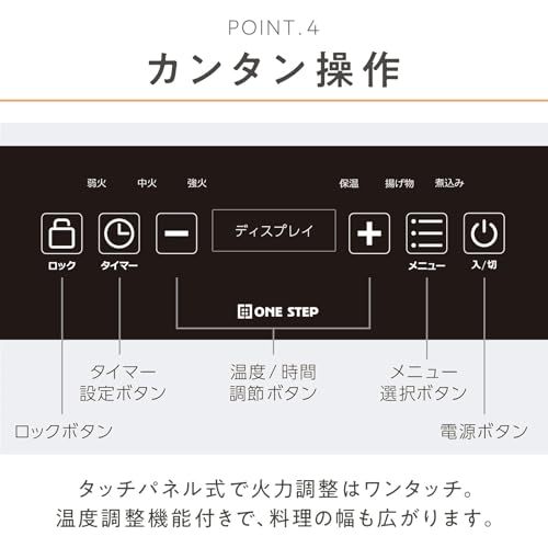 【操作はシンプルに】タッチパネル式で火力調整はワンタッチ、温度調整機能付きで、料理の幅も広がります。
