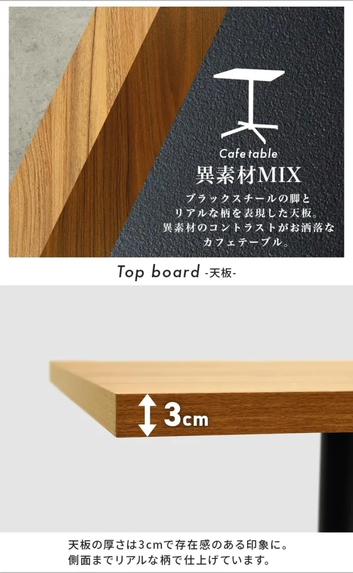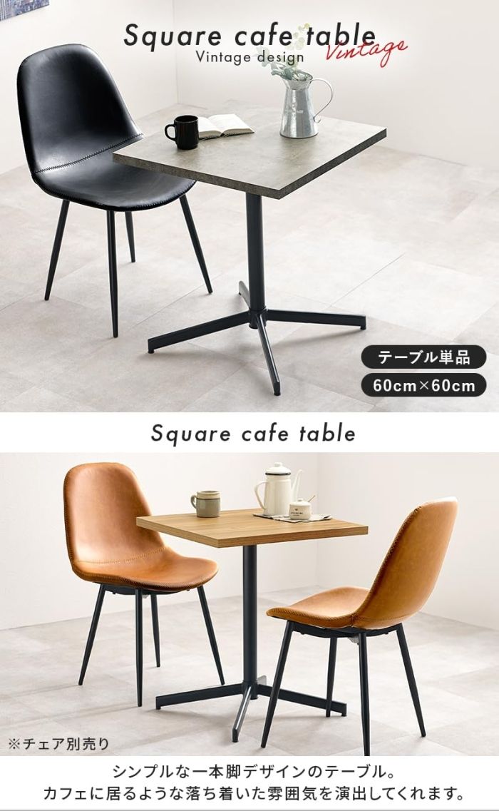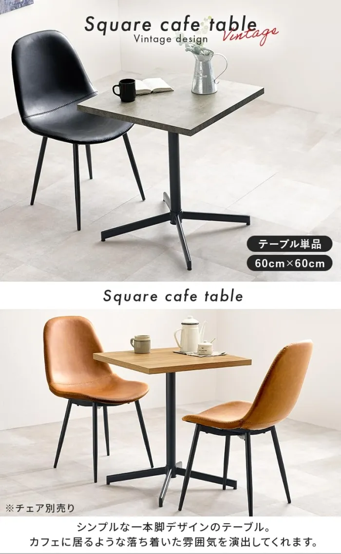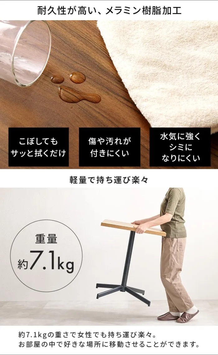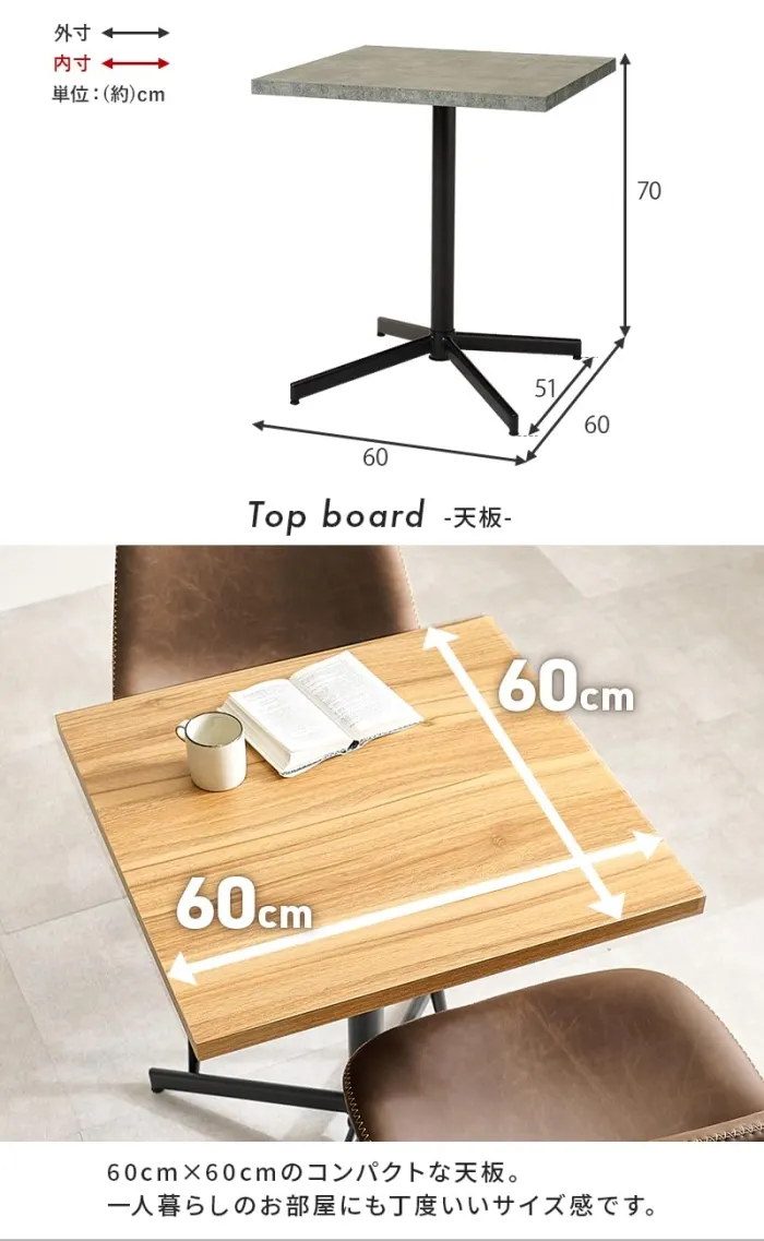 重厚感ある天板にスッキリとした1本脚を合わせたデザイン。コンパクトなサイズ感なので一人暮らしのお部屋にも置きやすくカフェのような空間を演出します。天板:合成樹脂化粧繊維板(メラミン樹脂)、脚部:スチール 組立式 アジャスター付(約)幅60×奥行60×高さ70cm