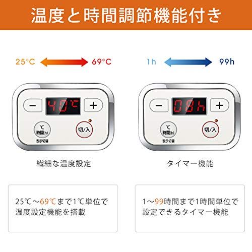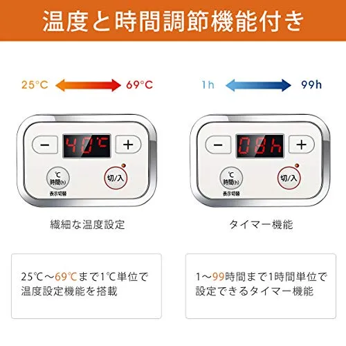 【温度と時間設定機能】市場では最高温度65くらい、48時間まで設定可能のものが多いですが、いろいろな温度範囲と時間範囲の低温調理をしたいお客様の声によって、弊社は独自の立体加熱構造で69、99hまでに改良しました。幅広く温度と時間を設定できるので、ヨーグルトだけではなく温泉卵、甘酒や麹など多彩な発酵食もお家で作れます。