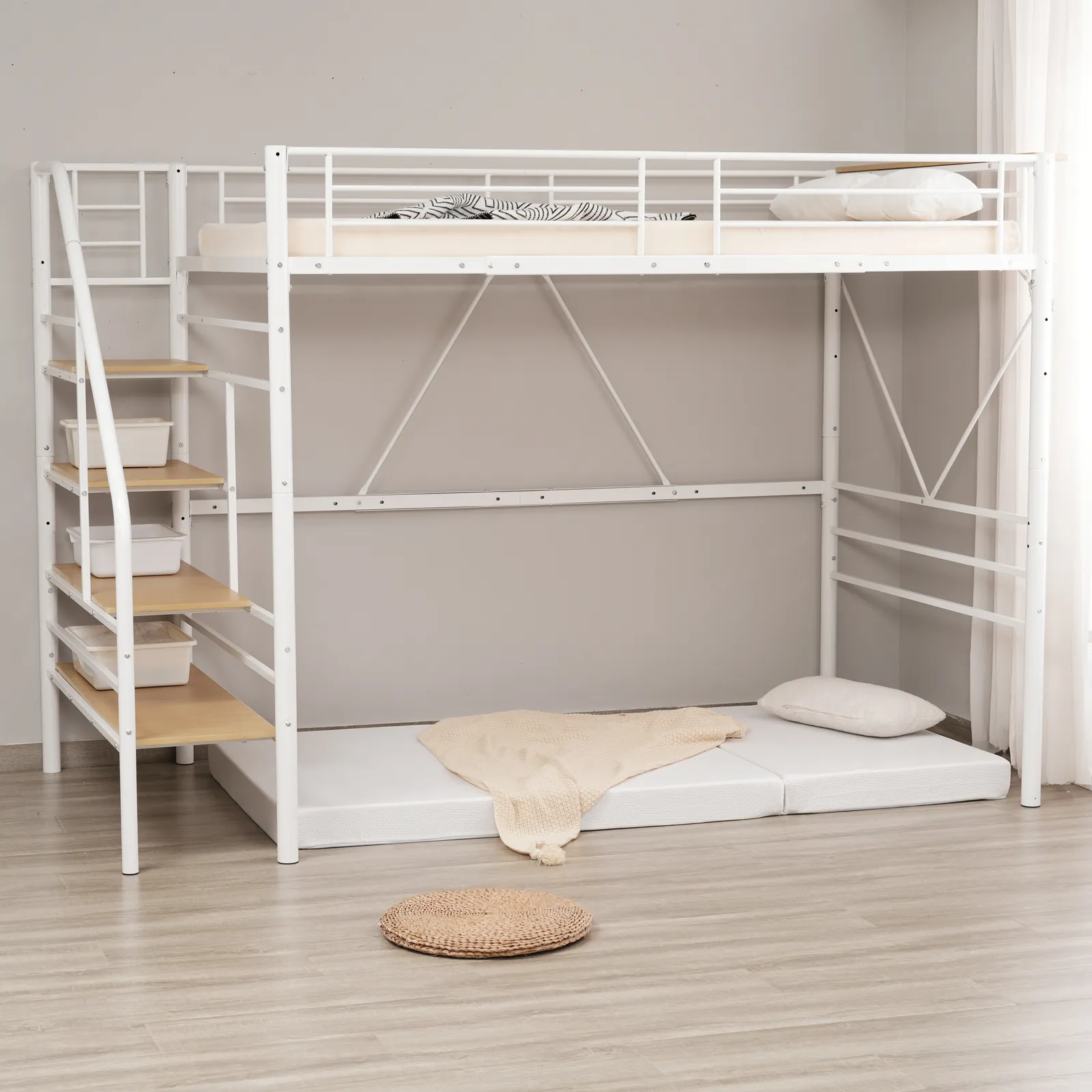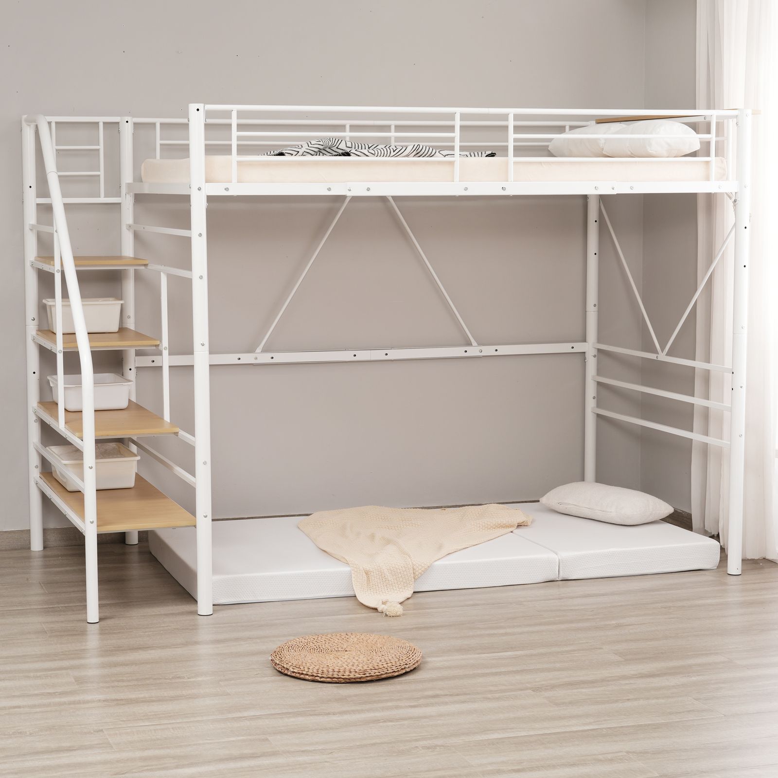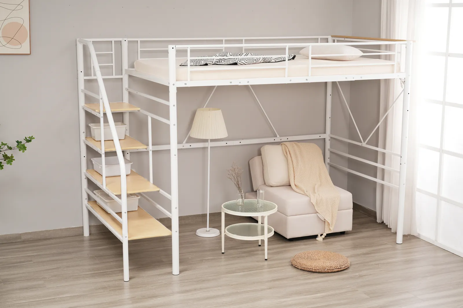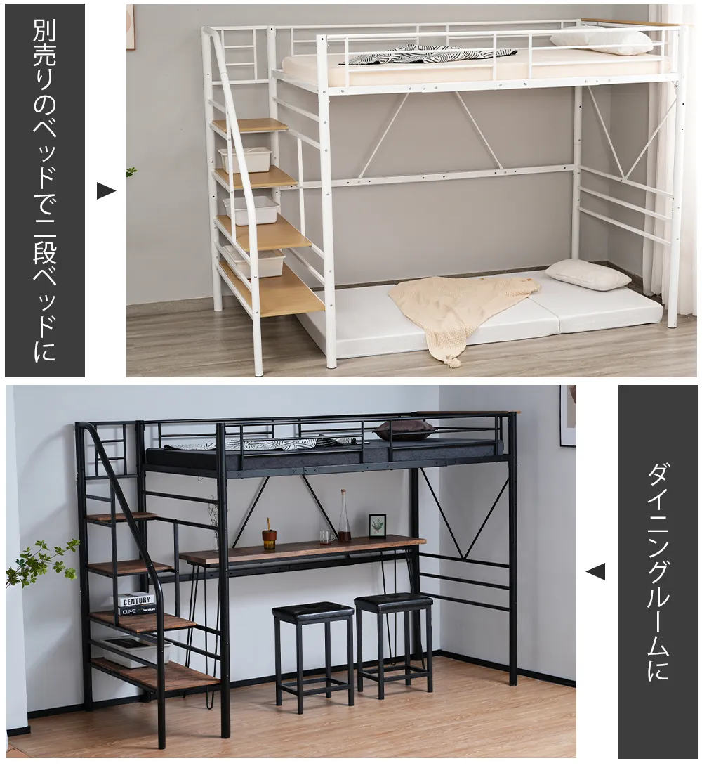 【ロフトベッドでお部屋を自由にデザイン】 ロフトベッドで限りあるスペースを賢く使って、お部屋をすっきりします。安全に昇り降りできる階段は収納棚にもなり、お部屋の限られたスペースを最大限に活用。 勉強スタイル、仕事スタイル、リビングスタイル、全部楽しめます!