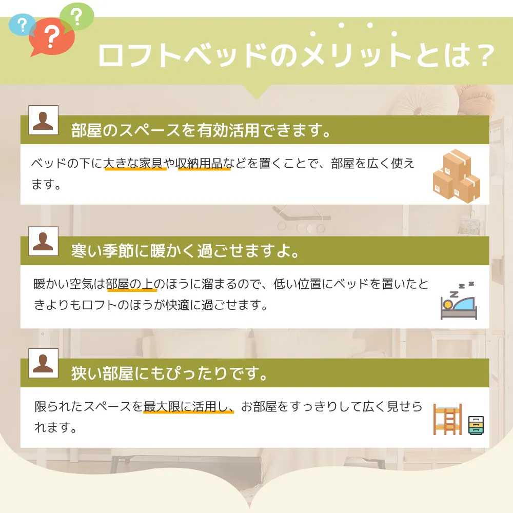 【大容量の収納スペース】収納用品などを十分置けるので、ベッドの下を生活スペースとして有効活用できます。