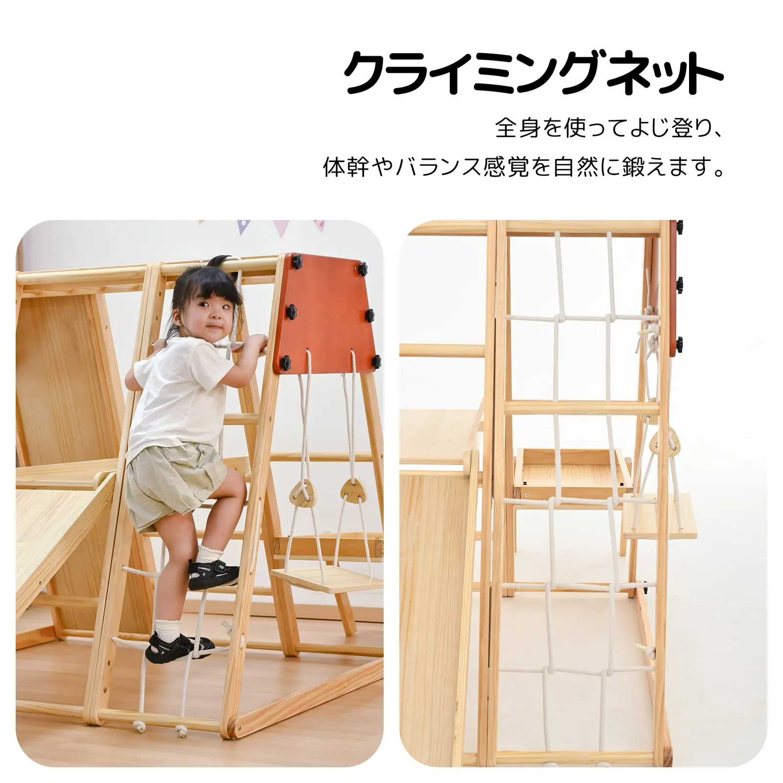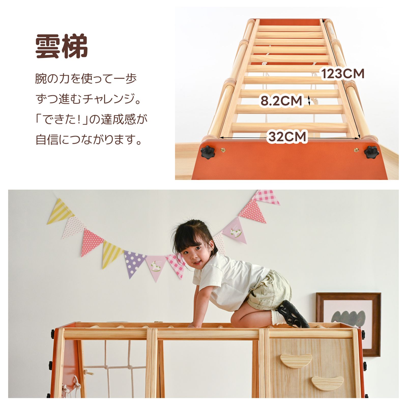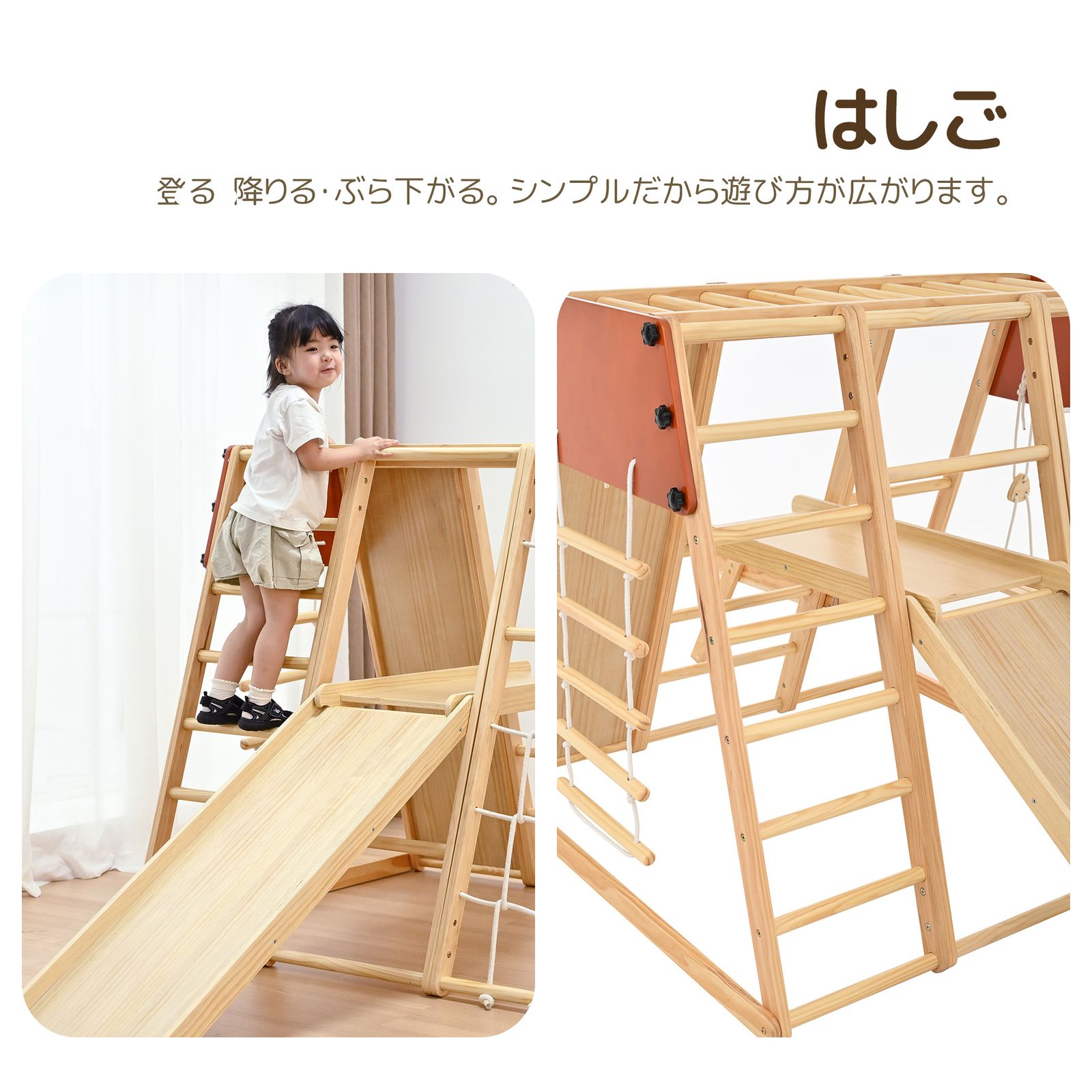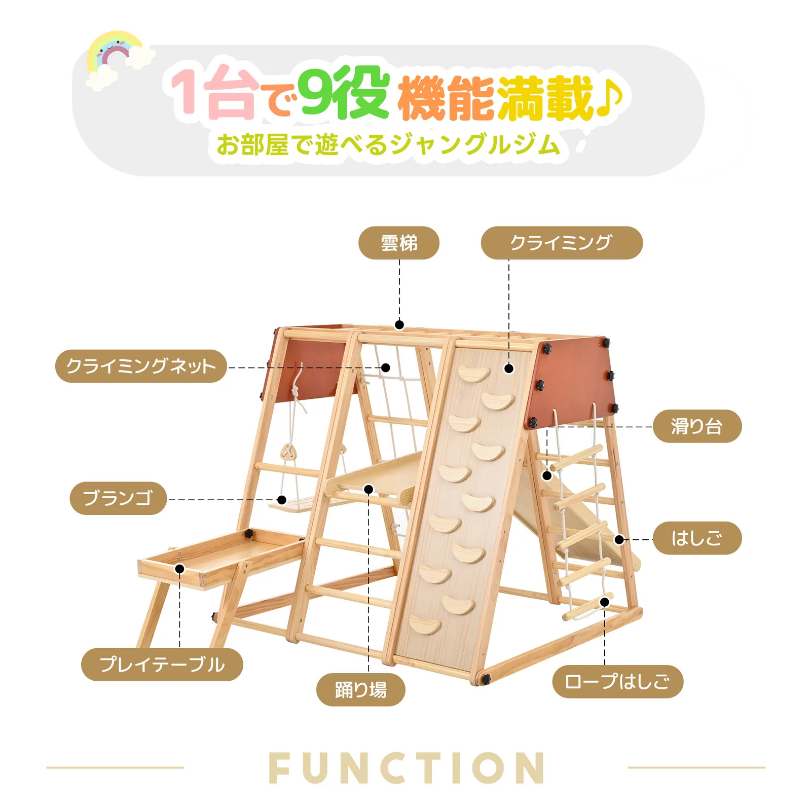 ・◎01雨の日や暑い日でも、おうちが公園に早変わり。安心設計の木製ジャングルジムで、子どもはのびのび遊びながら運動能力やバランス感覚を育てられます。ママも見守りやすく、毎日の遊びがもっと楽しくなります。1台で9役 機能満載 1.雲梯 2.クライミングネット 3.滑り台 4.ロープはしご 5.はしご 6.クライミング 7.踊り場 8.プレイテーブル 9.ブランゴ