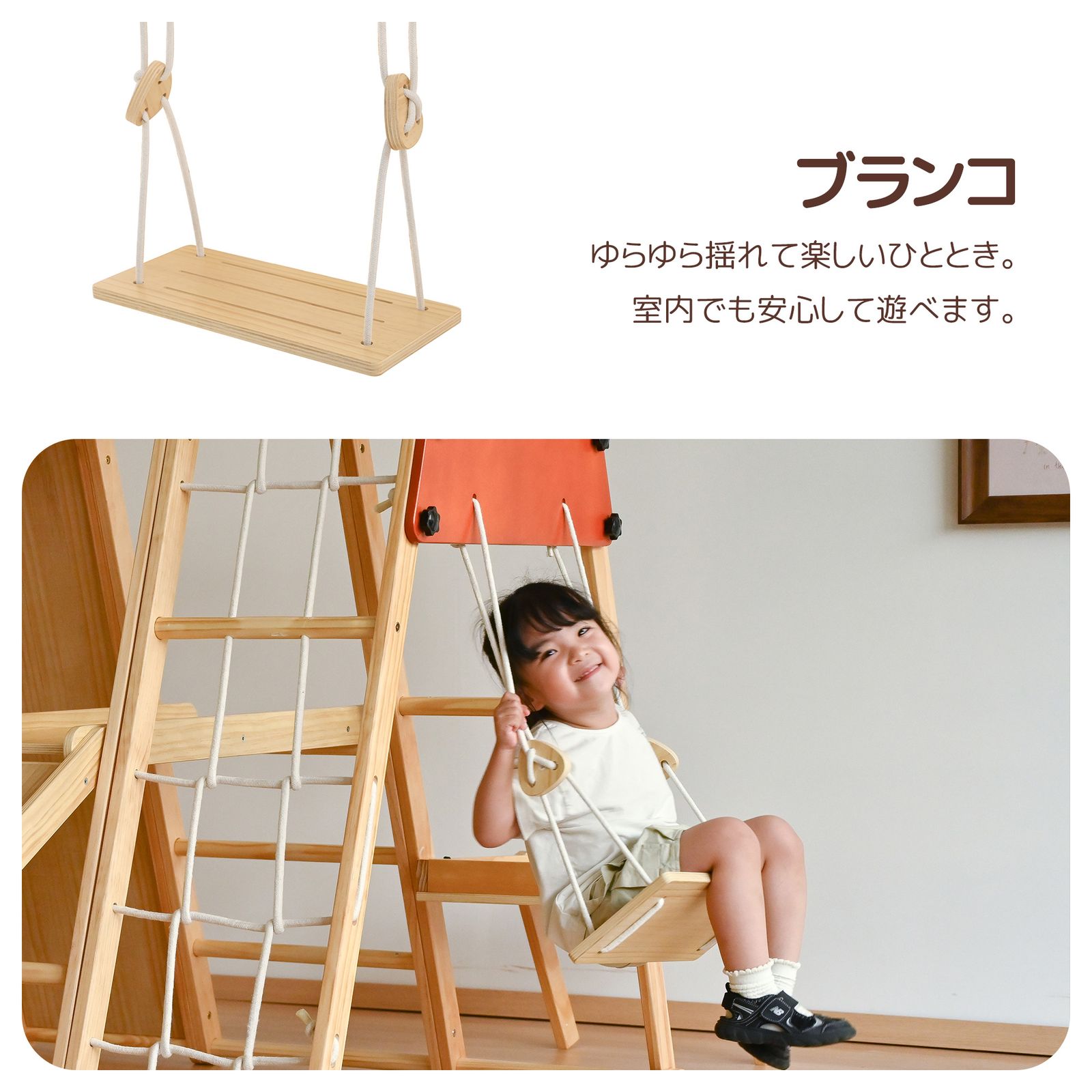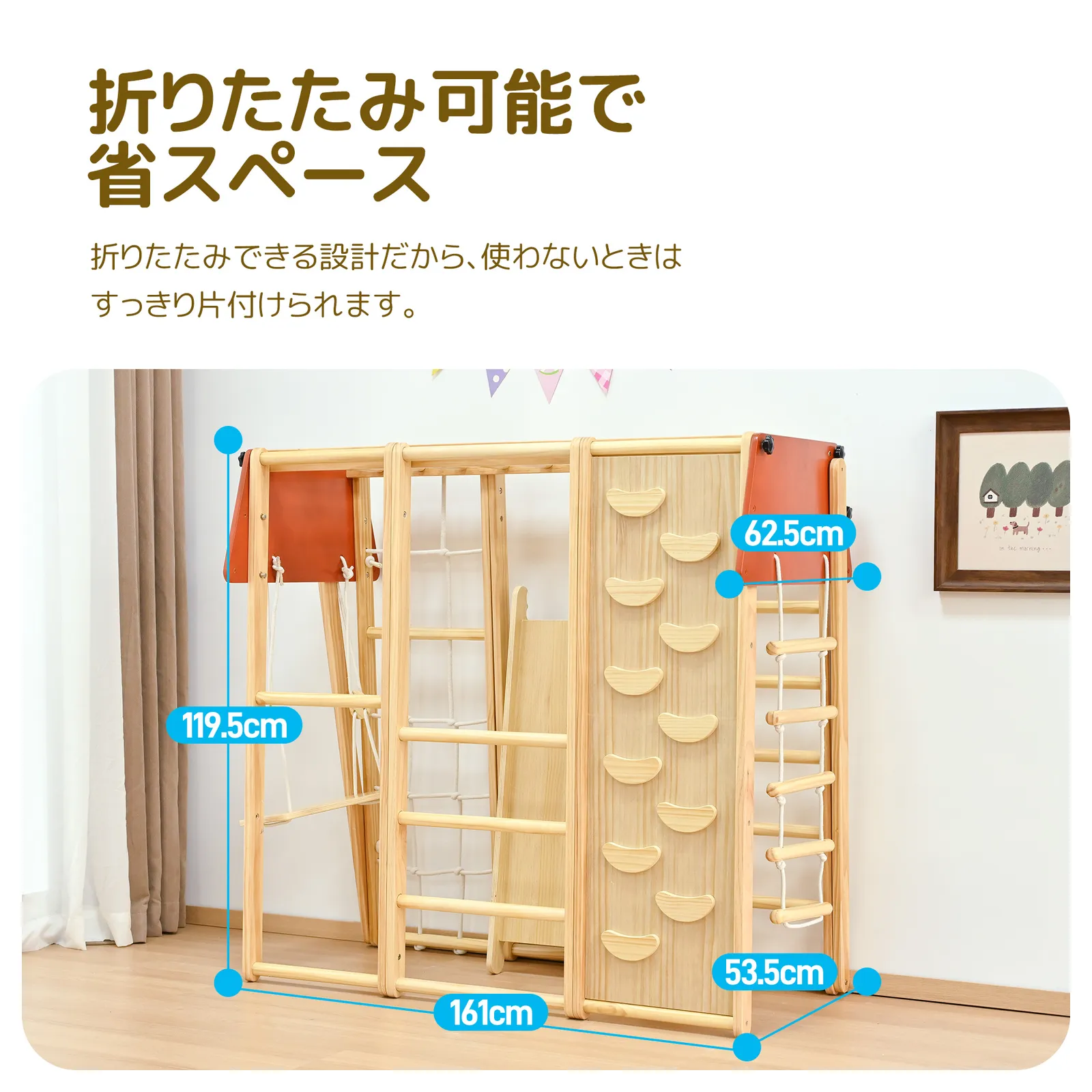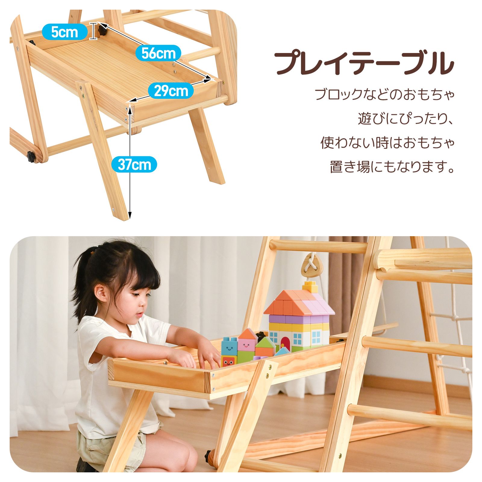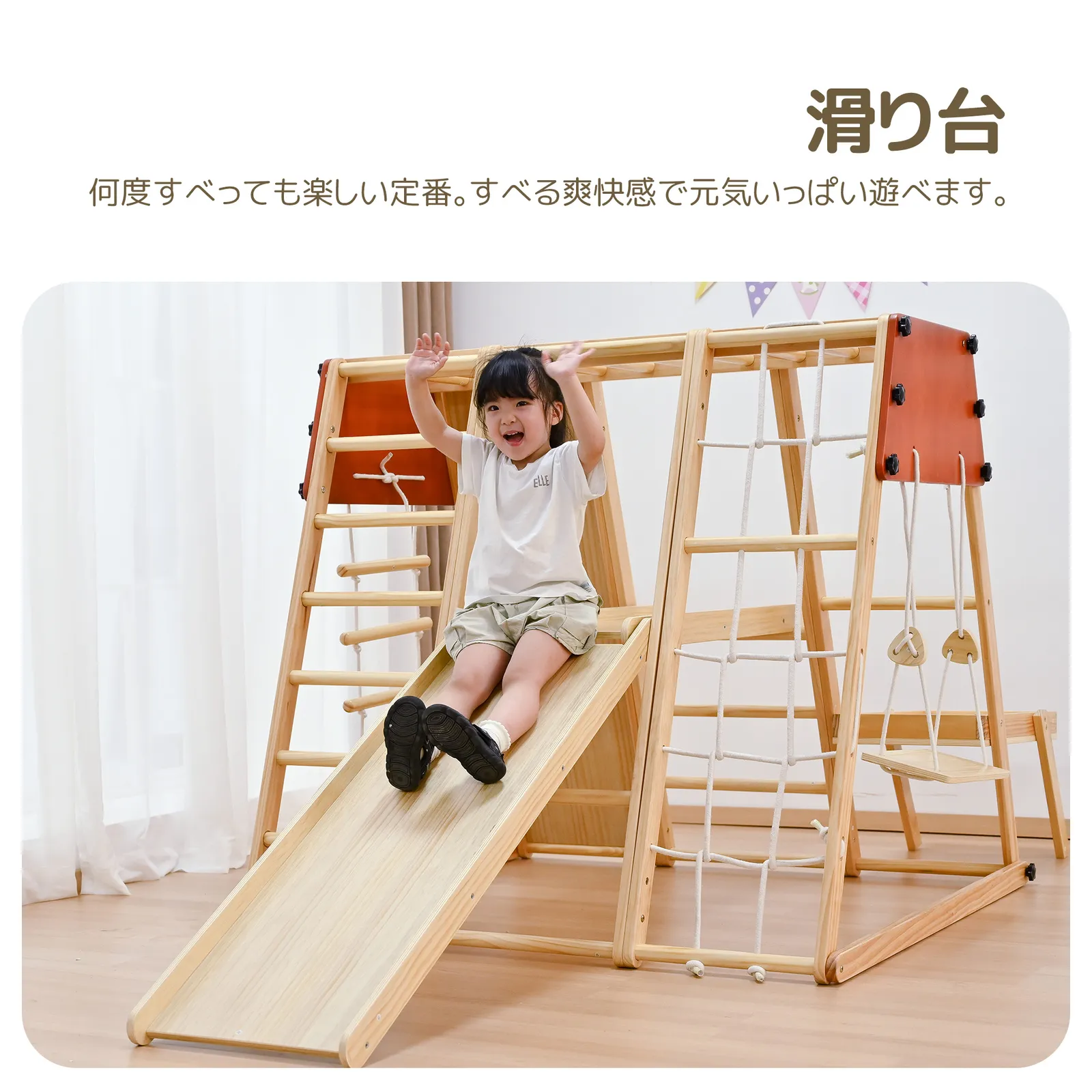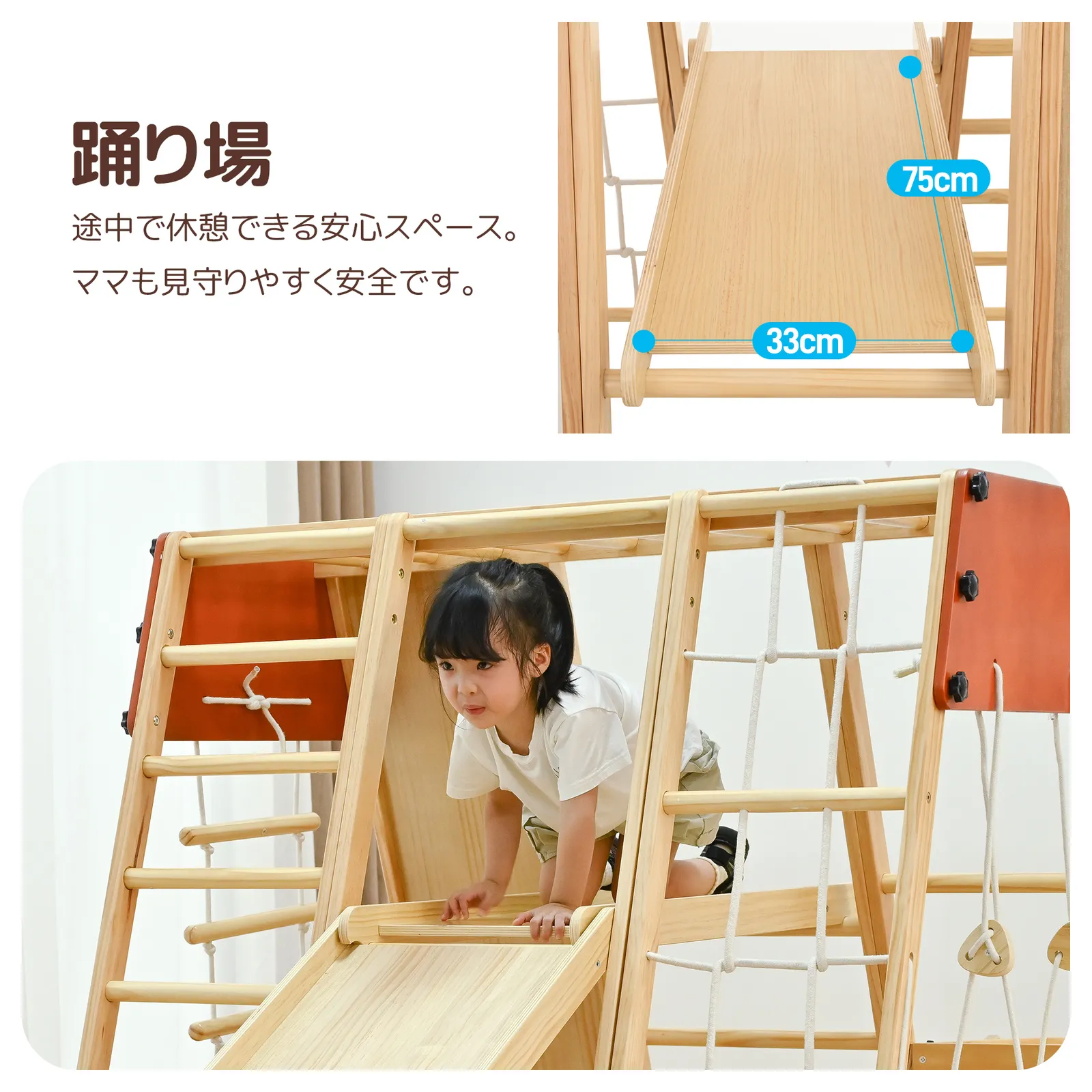 ・◎01雨の日や暑い日でも、おうちが公園に早変わり。安心設計の木製ジャングルジムで、子どもはのびのび遊びながら運動能力やバランス感覚を育てられます。ママも見守りやすく、毎日の遊びがもっと楽しくなります。1台で9役 機能満載 1.雲梯 2.クライミングネット 3.滑り台 4.ロープはしご 5.はしご 6.クライミング 7.踊り場 8.プレイテーブル 9.ブランゴ