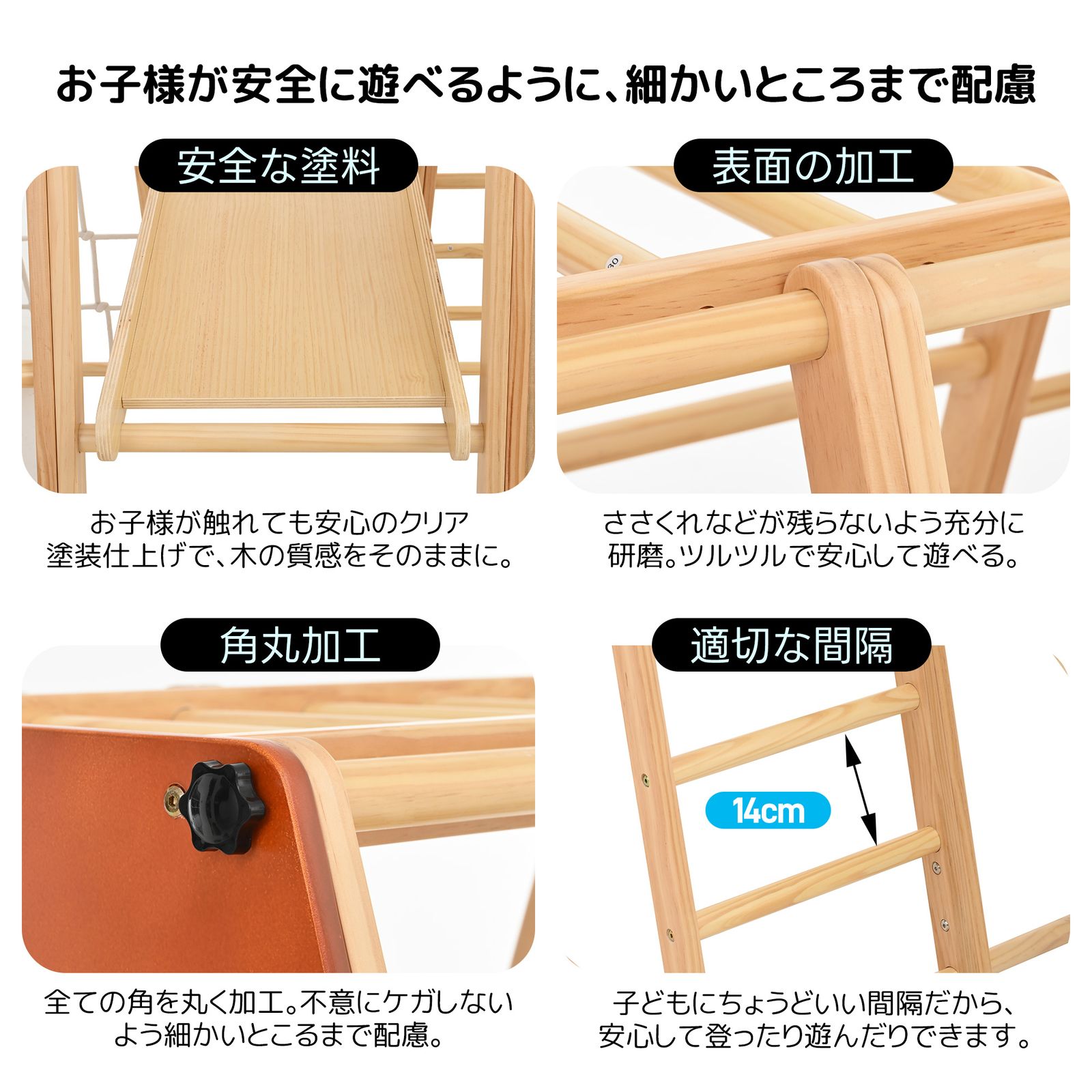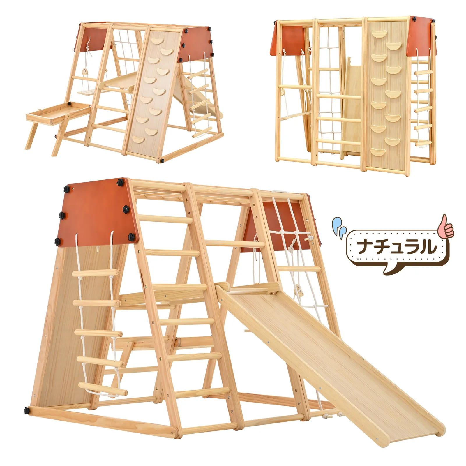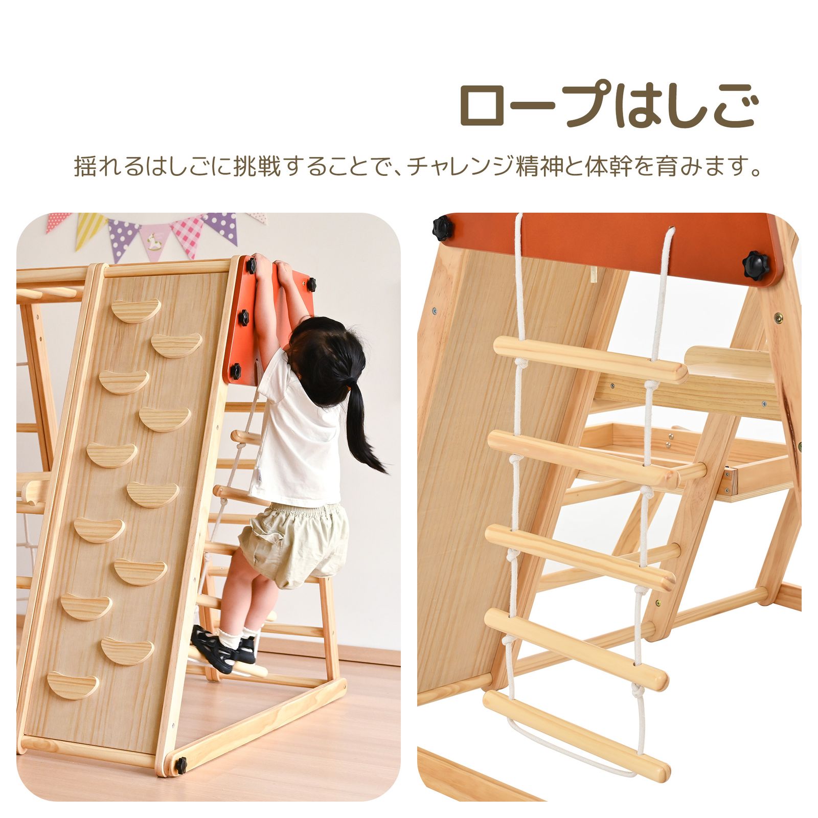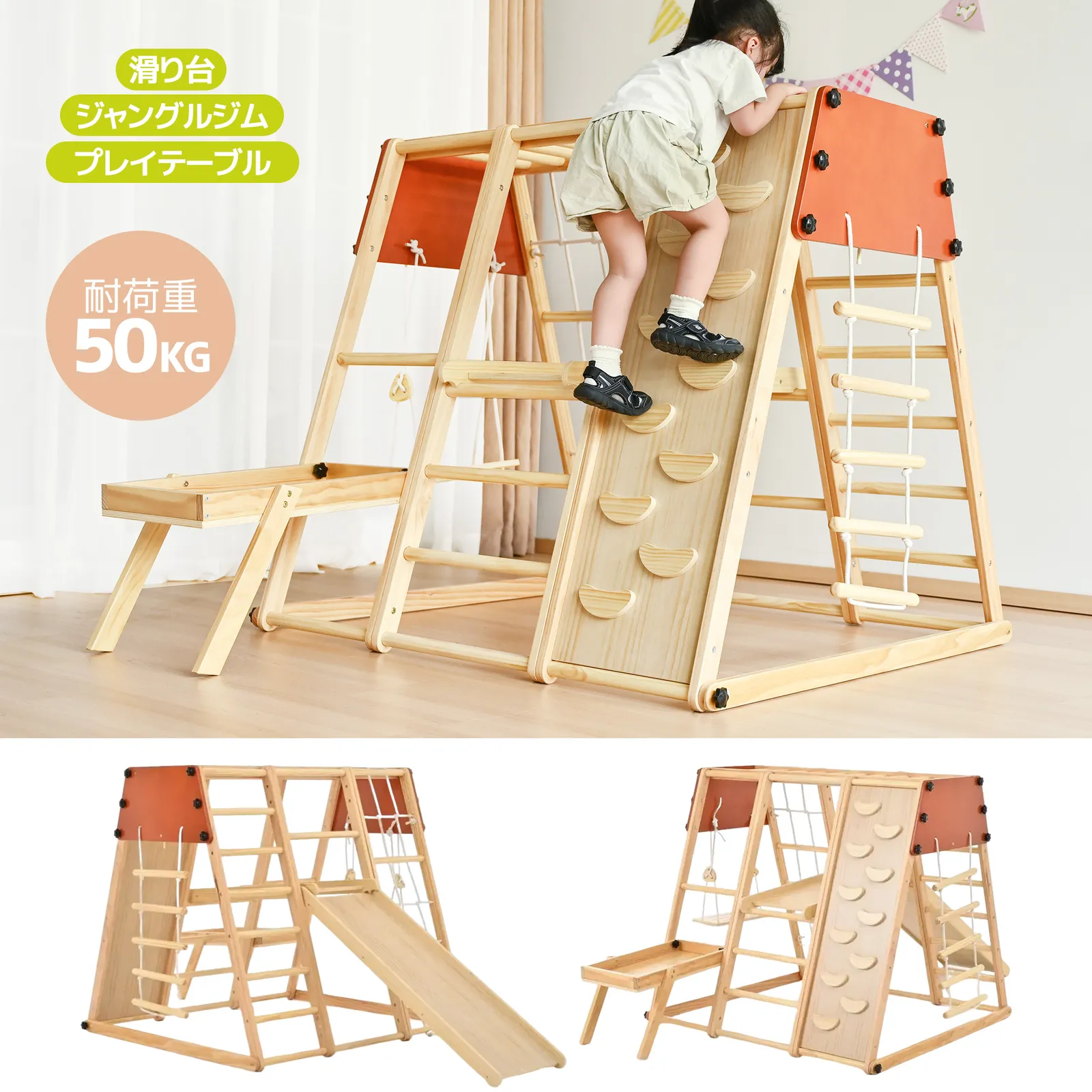 ・◎01雨の日や暑い日でも、おうちが公園に早変わり。安心設計の木製ジャングルジムで、子どもはのびのび遊びながら運動能力やバランス感覚を育てられます。ママも見守りやすく、毎日の遊びがもっと楽しくなります。1台で9役 機能満載 1.雲梯 2.クライミングネット 3.滑り台 4.ロープはしご 5.はしご 6.クライミング 7.踊り場 8.プレイテーブル 9.ブランゴ