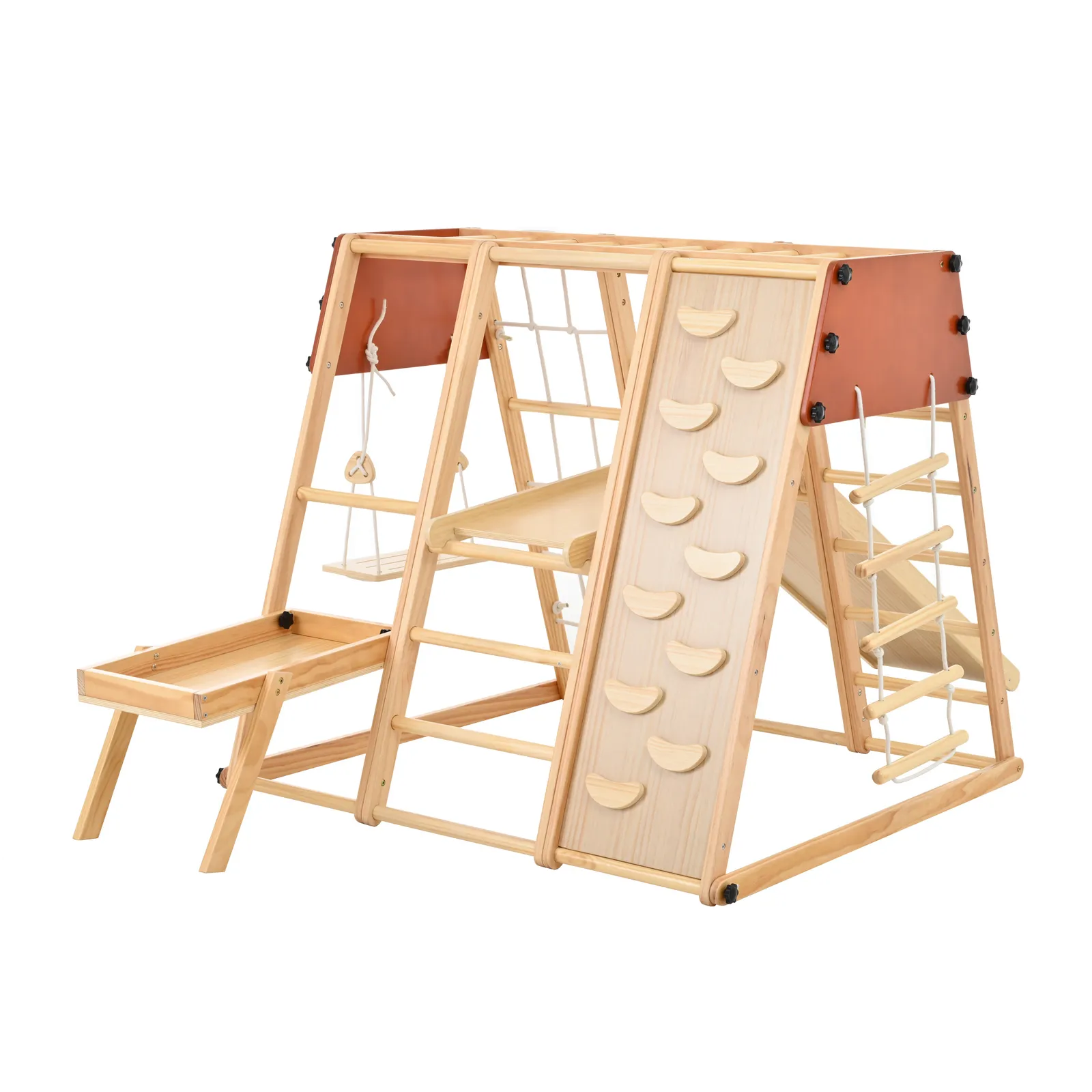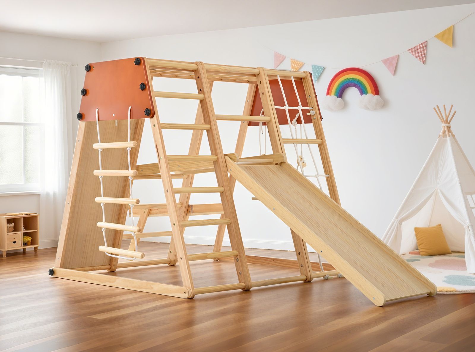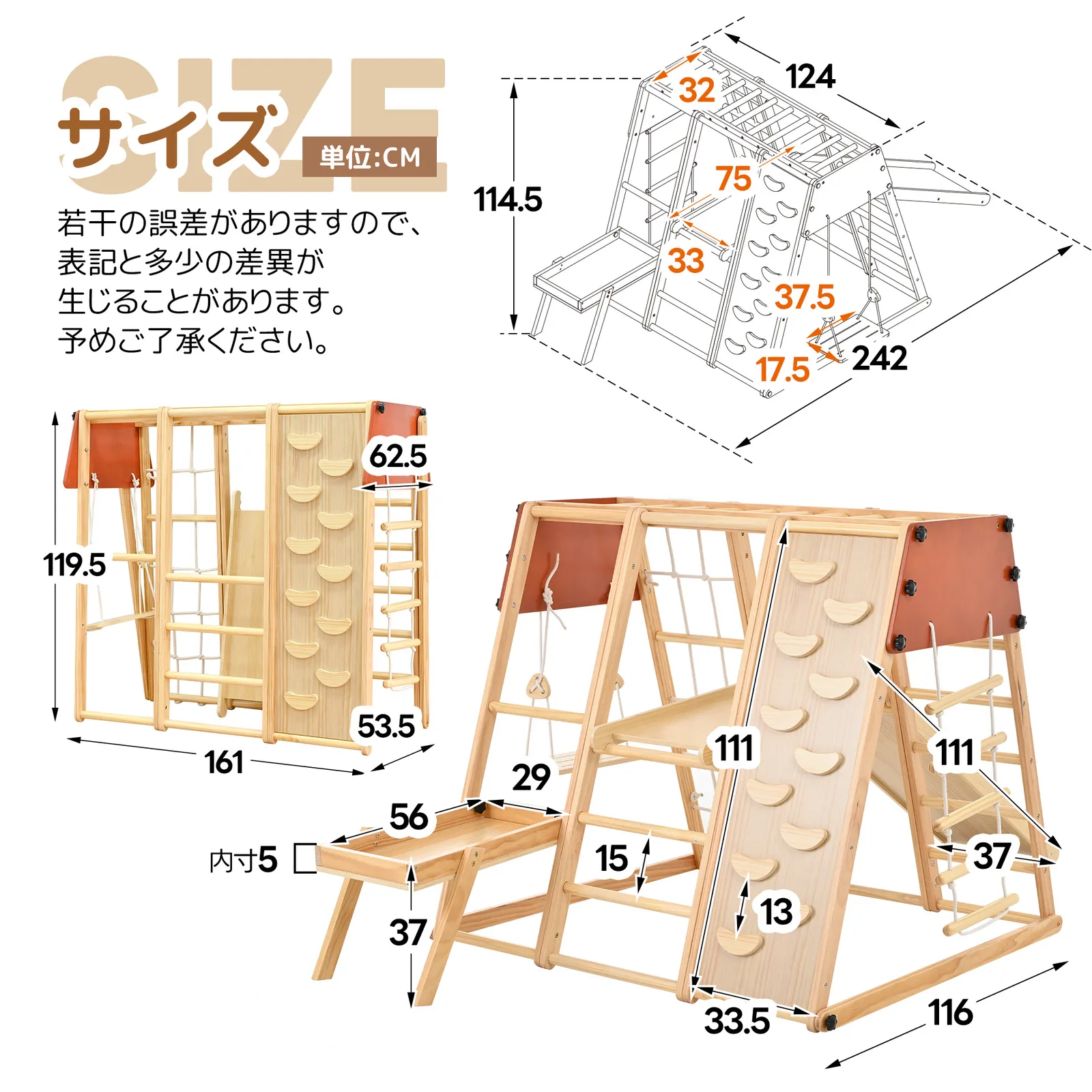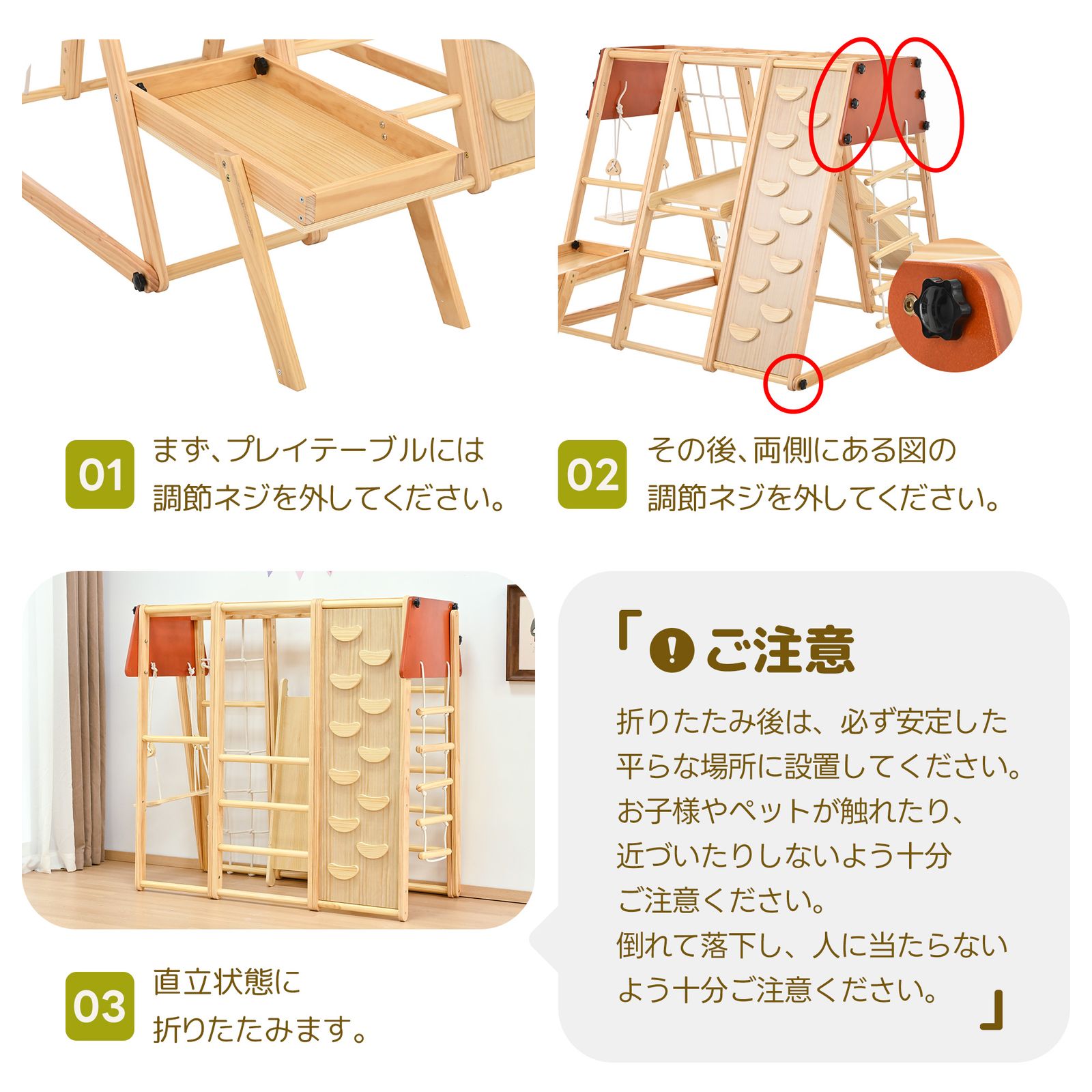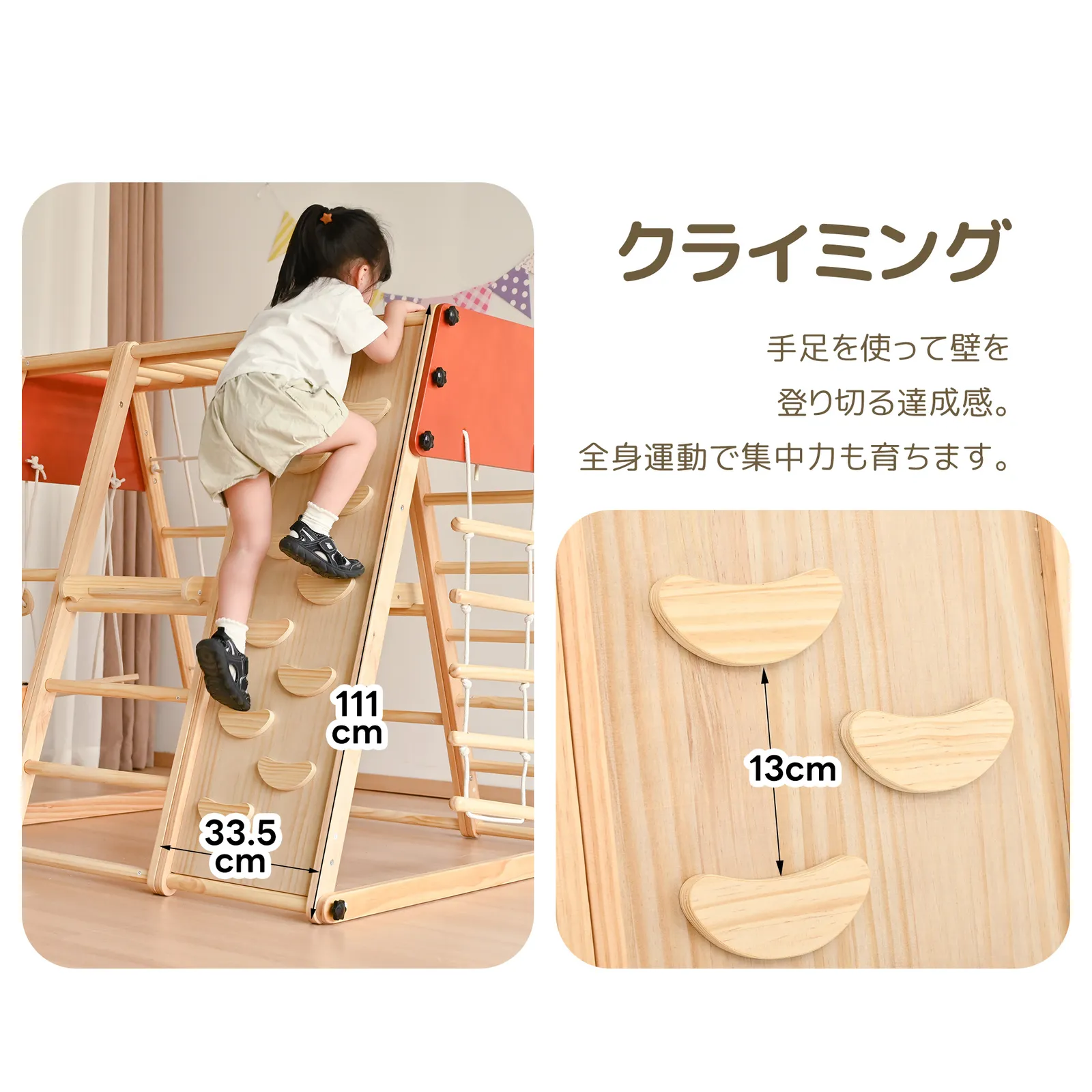 ・◎01雨の日や暑い日でも、おうちが公園に早変わり。安心設計の木製ジャングルジムで、子どもはのびのび遊びながら運動能力やバランス感覚を育てられます。ママも見守りやすく、毎日の遊びがもっと楽しくなります。1台で9役 機能満載 1.雲梯 2.クライミングネット 3.滑り台 4.ロープはしご 5.はしご 6.クライミング 7.踊り場 8.プレイテーブル 9.ブランゴ