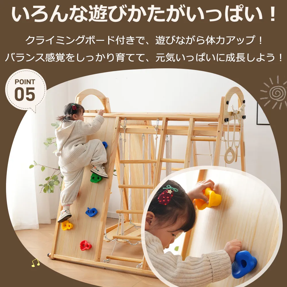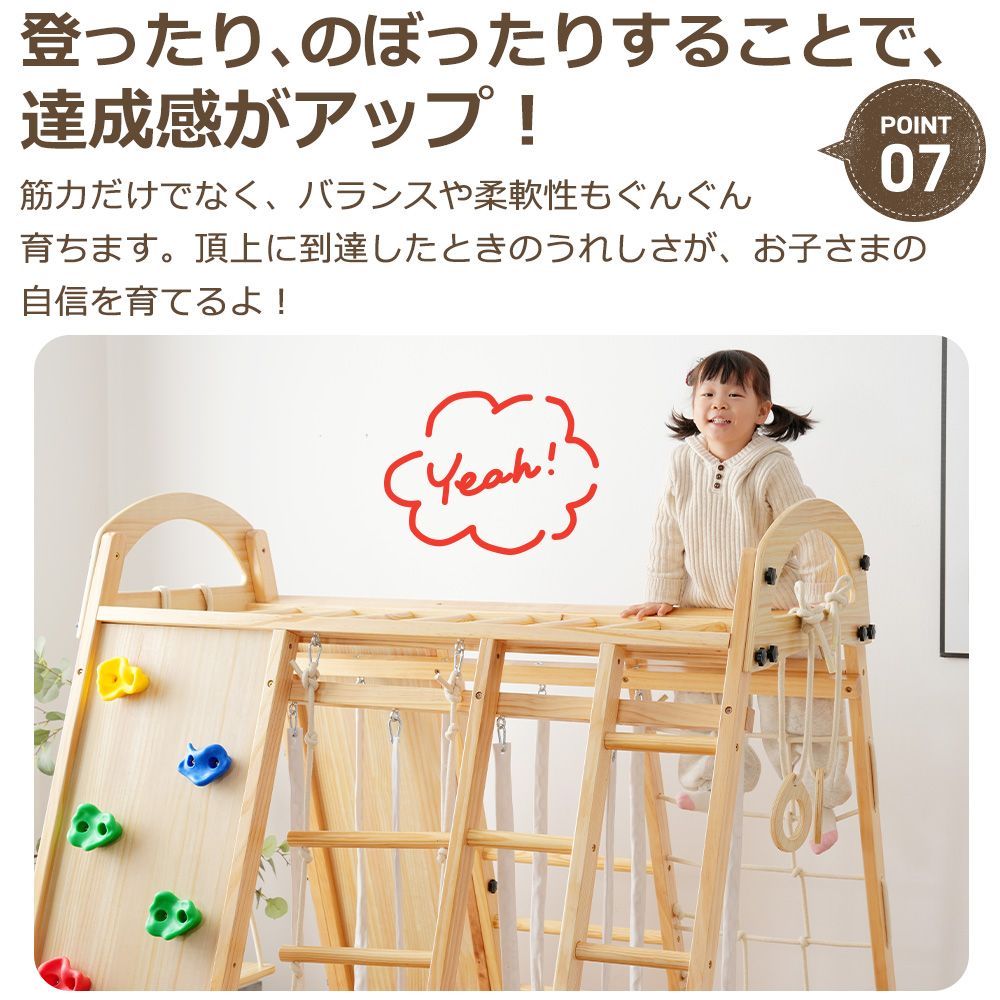 【クライミングウォ一ル】達成感アップ筋力だけでなく、バランス感覚や柔軟性も養うことができます。また、頂上に到達する喜びが、お子さまの自尊心を育む手助けとなります。