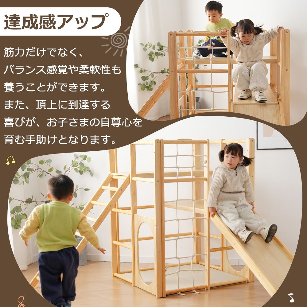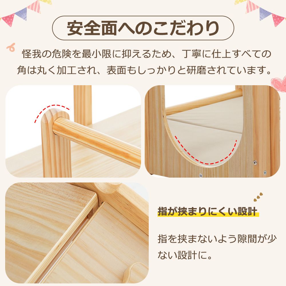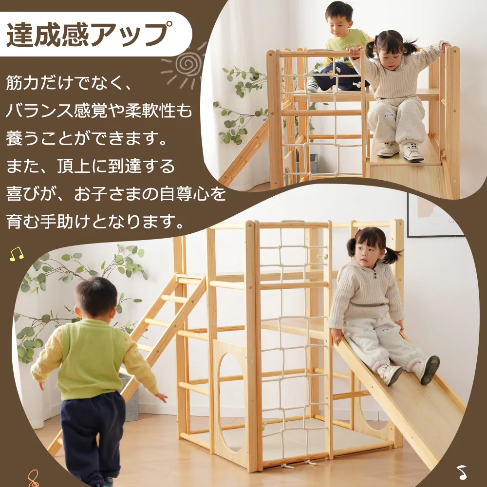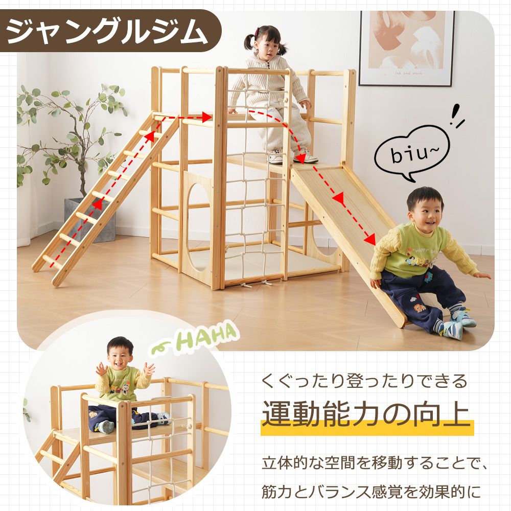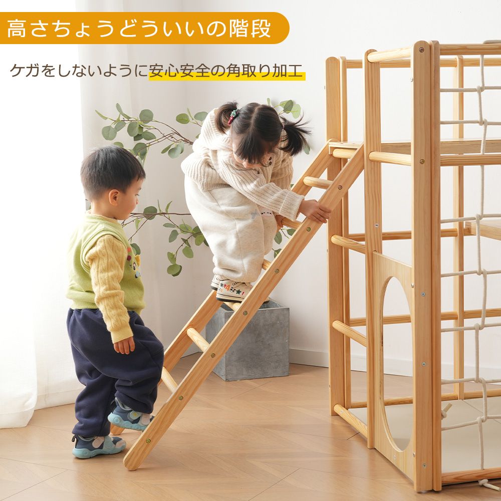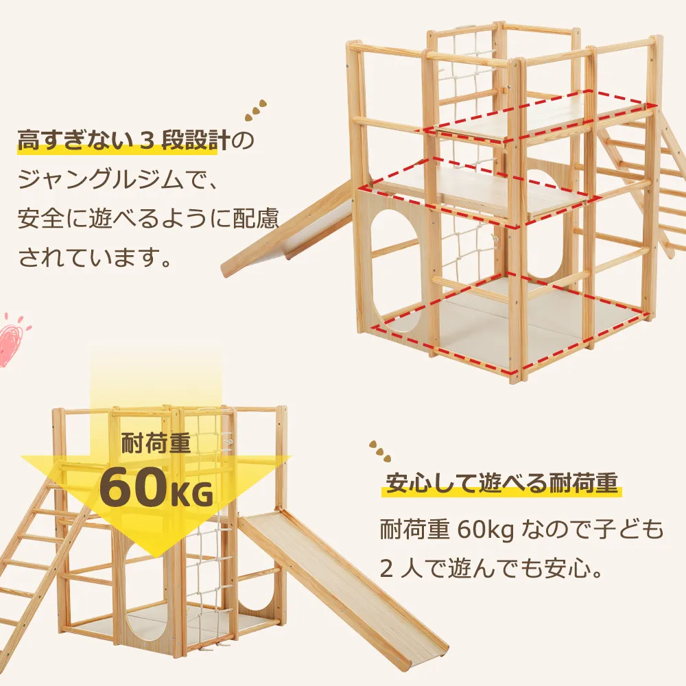 【安全面へのこだわり】怪我の危険を最小限に抑えるため、丁寧に仕上すべての角は丸く加工され、表面もしっかりと研磨されています。指が挟まりにくい設計 指を挟まないよう隙間が少ない設計に。高すぎない 3段設計のジャングルジムで、安全に遊べるように配慮されています。安心して遊べる耐荷重 耐荷重60kgなので子ども2人で遊んでも安心。