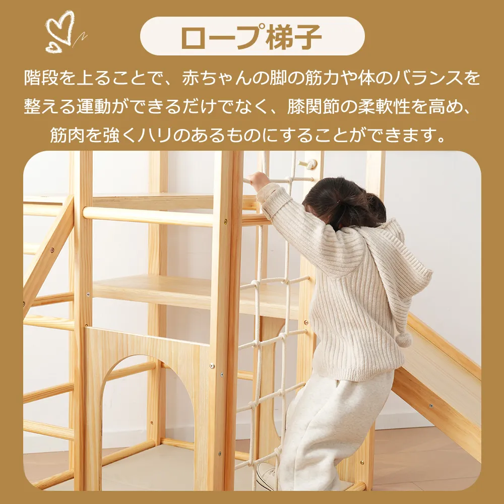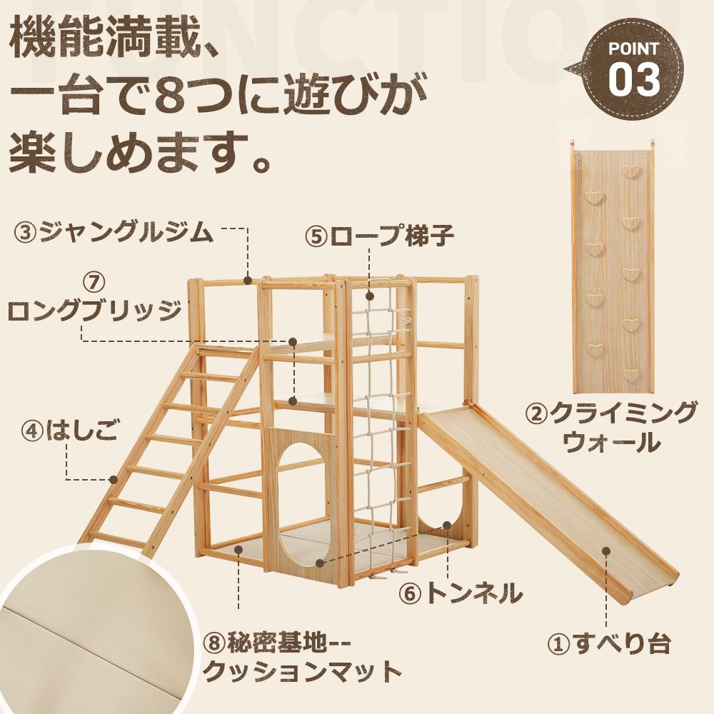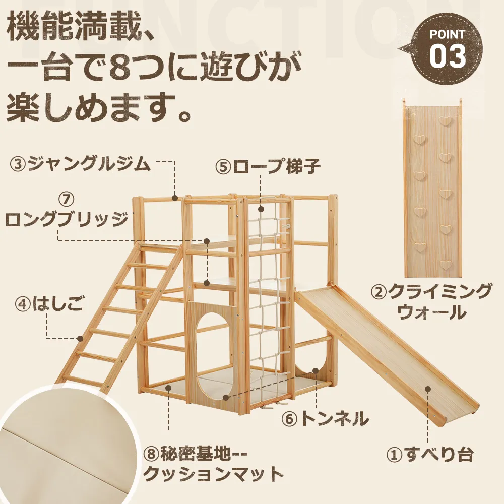 【機能満載、一台で6つに遊びが楽しめます。】①すべり台 ②クライミングウォ一ル ③ジャングルジム ④はしご ⑤ロープ梯子 ⑥トンネル 7.ロングブリッジ 8.秘密基地--クッションマット