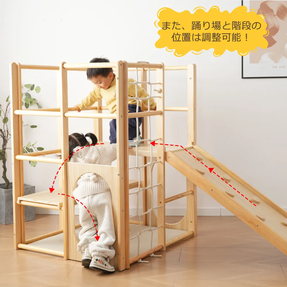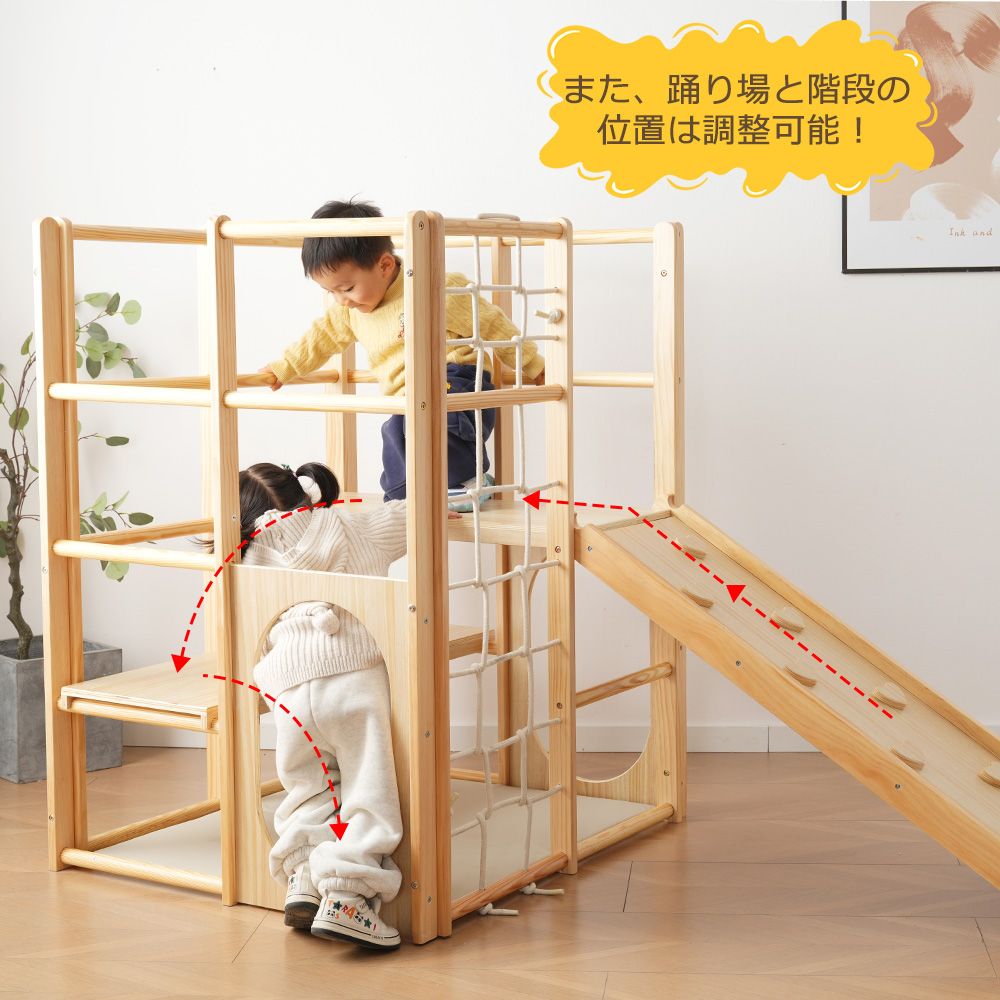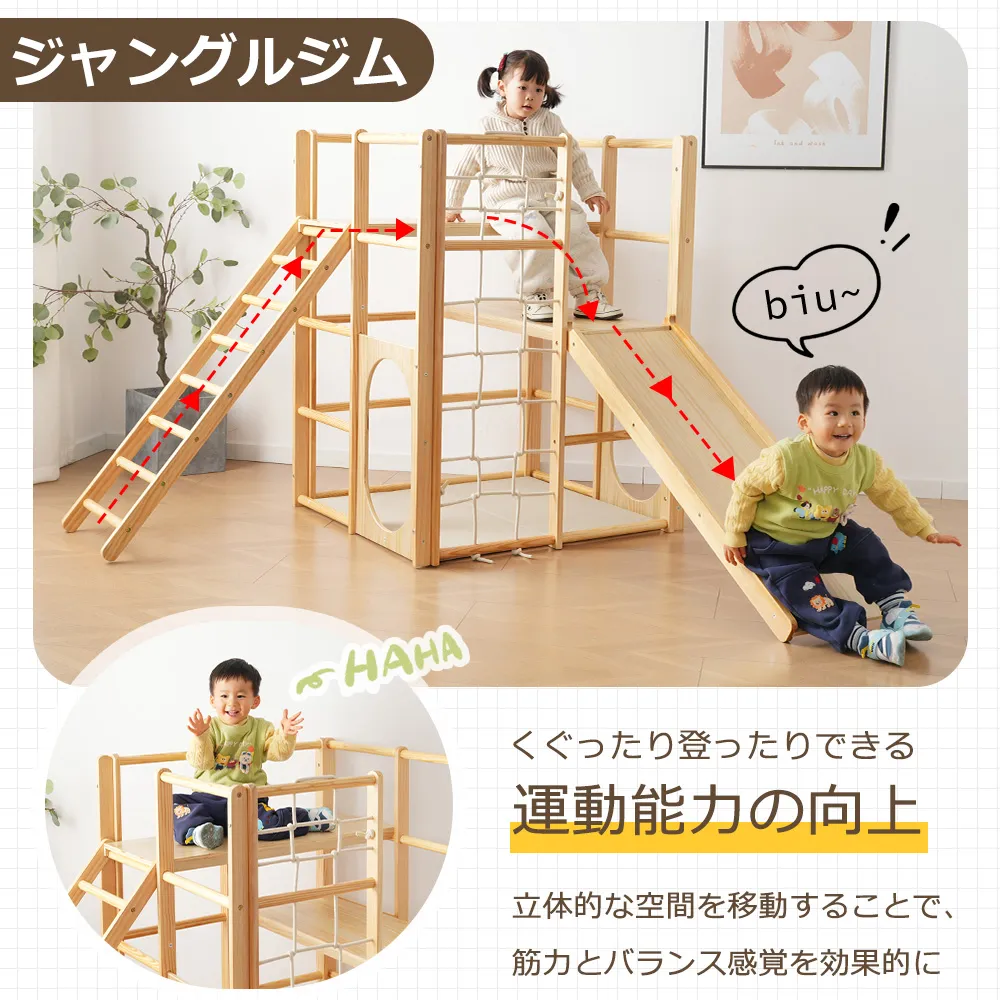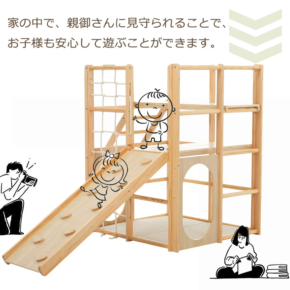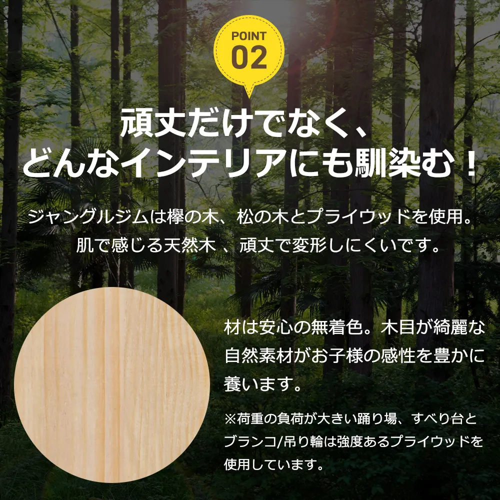 【頑丈だけでなく、どんなインテリアにも馴染む!】ジャングルジムは松の木とプライウッドを使用。 肌で感じる天然木 、頑丈で変形しにくいです。材は安心の無着色。木目が綺麗な自然素材がお子様の感性を豊かに養います。※荷重の負荷が大きい踊り場、すべり台と通路は強度あるプライウッドを使用しています。