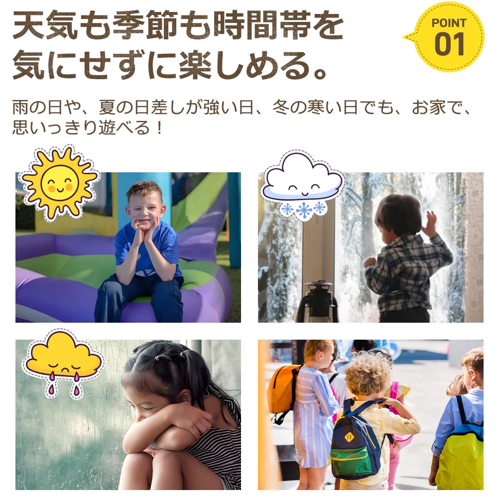 【天気も季節も時間帯を気にせずに楽しめる。】雨の日や、夏の日差しが強い日、冬の寒い日でも、お家で、思いっきり遊べる!家の中で、親御さんに見守られることで、お子様も安心して遊ぶことができます。