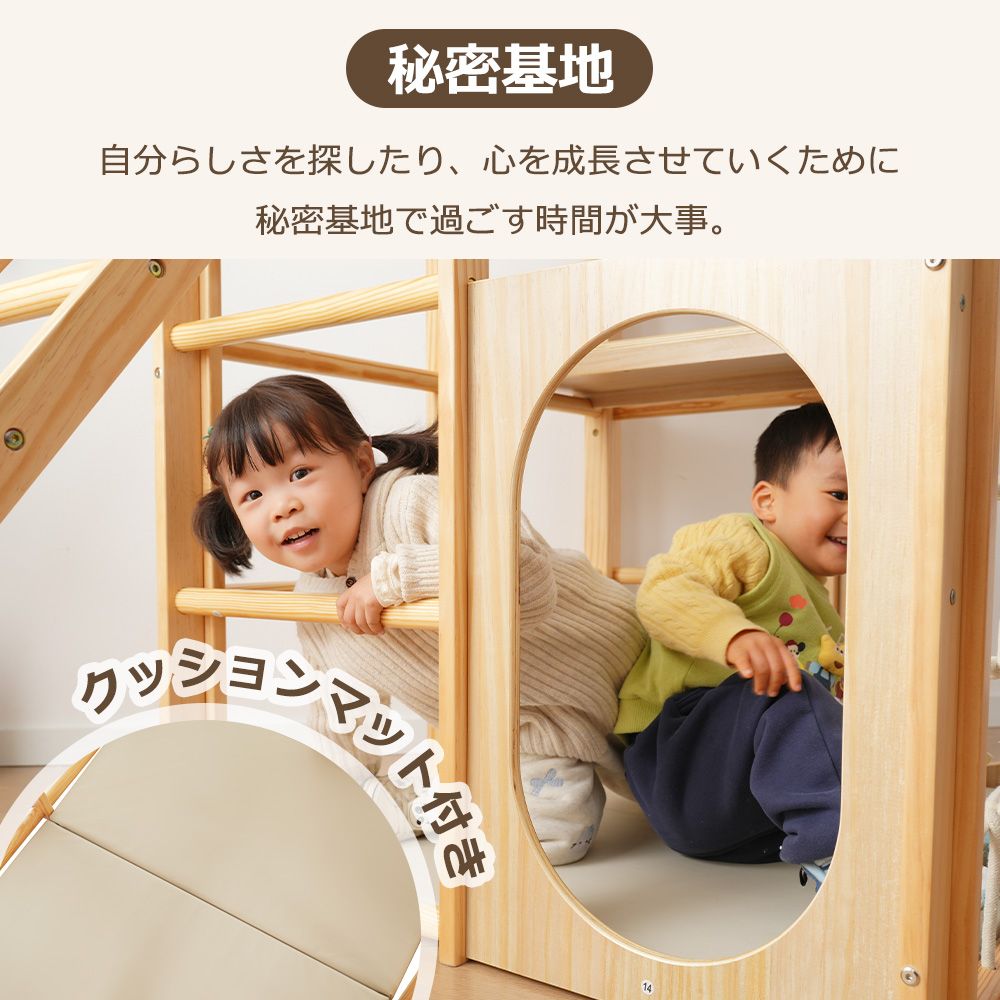 【秘密基地】自分らしさを探したり、心を成長させていくために秘密基地で過ごす時間が大事。達成感アップ 筋力だけでなく、バランス感覚や柔軟性も養うことができます。また、頂上に到達する喜びが、お子さまの自尊心を育む手助けとなります。