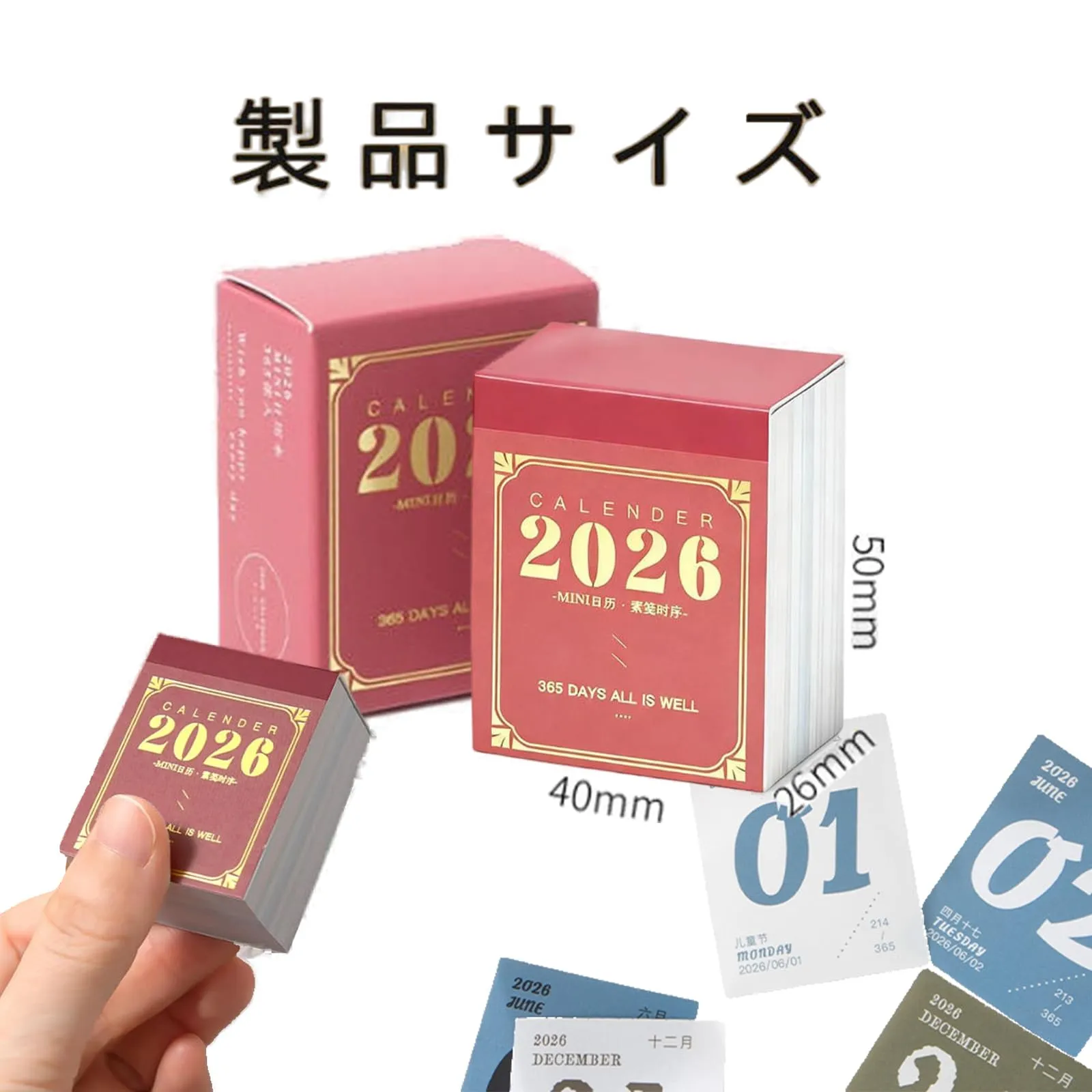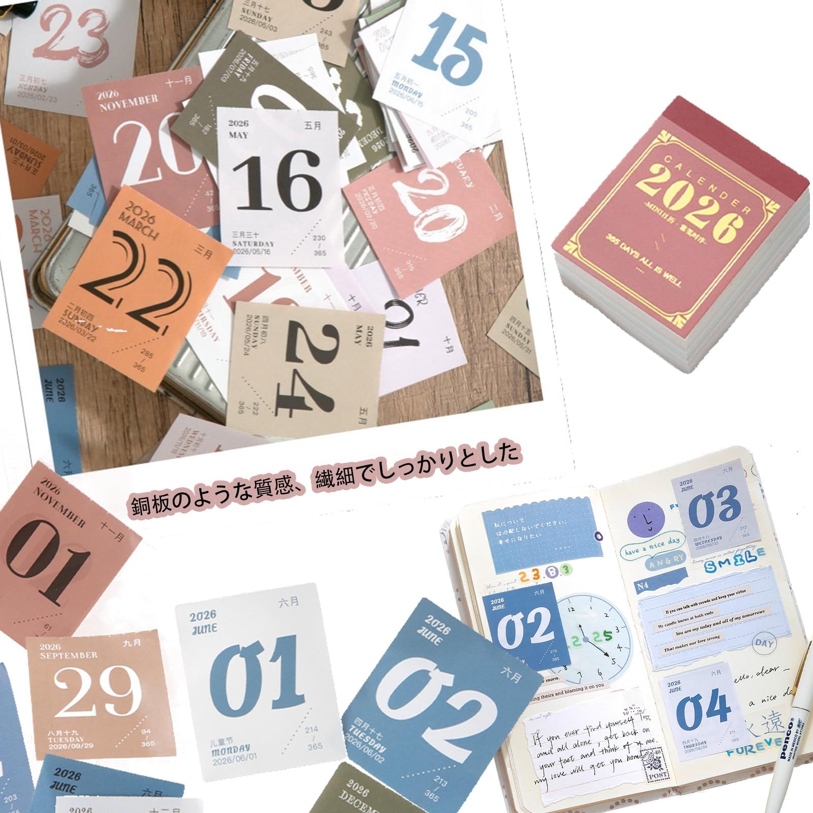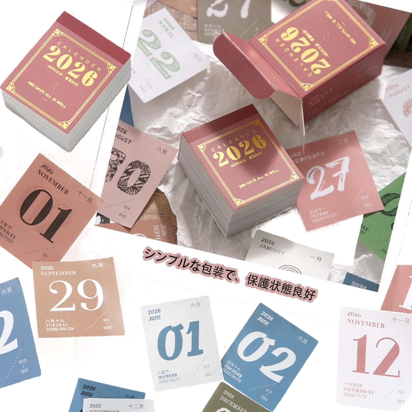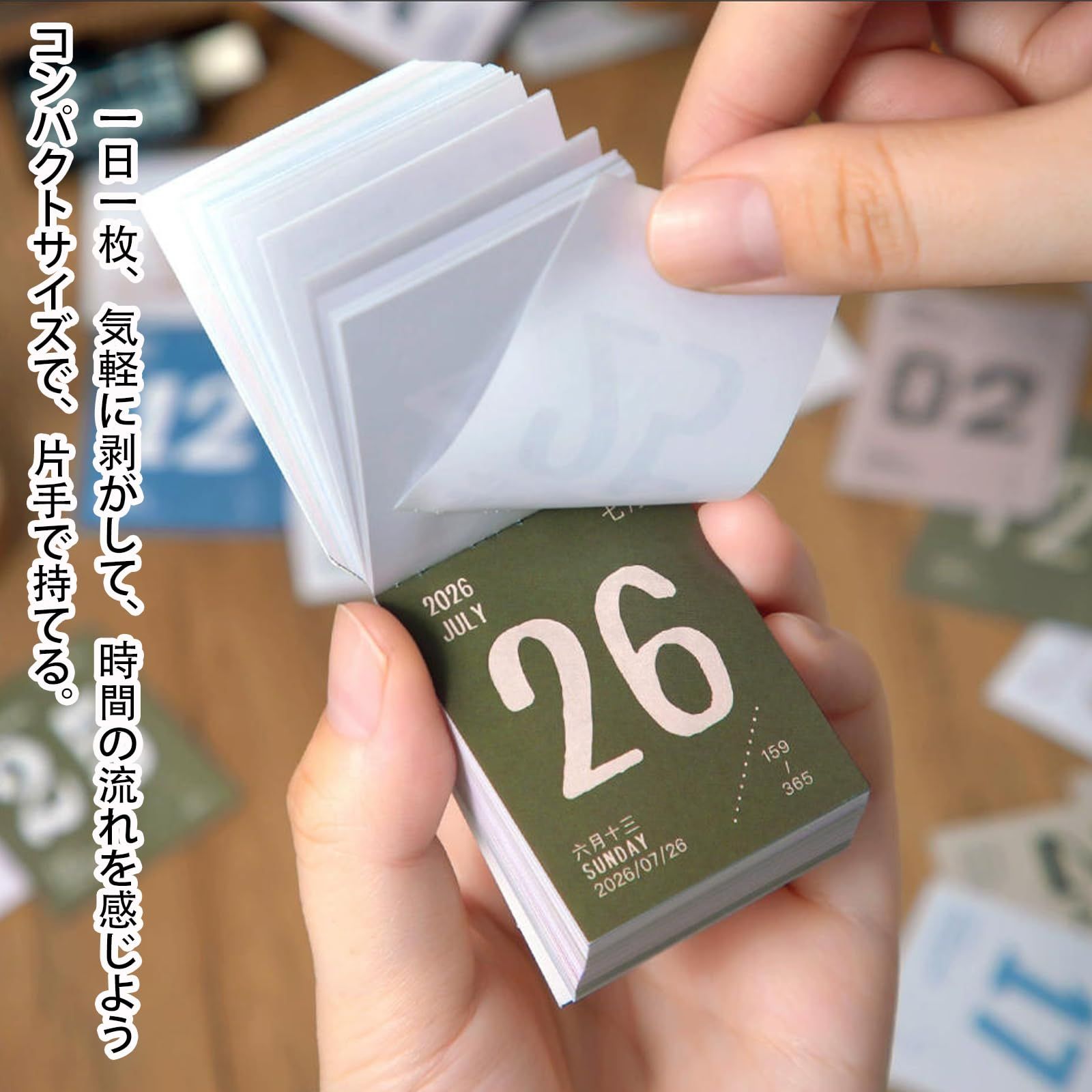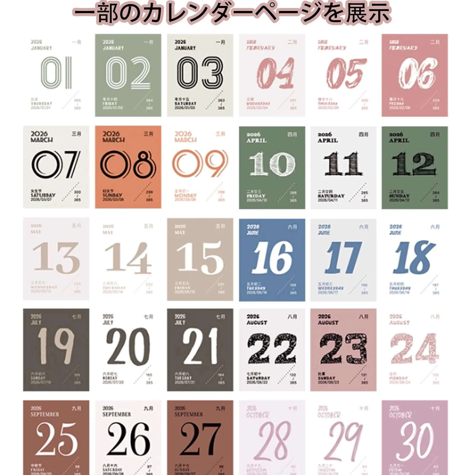 【豊富なデザイン】 2026 ミニカレンダーには365枚のページがあり、2026年1月から12月までをカバー。毎月異なるスタイルのデザインで、視覚的に楽しく日付確認ができます。この2026 ミニカレンダーは、実用性と装飾性を兼ね備え。2026 ミニカレンダーで、デスクを華やかに彩りましょう。