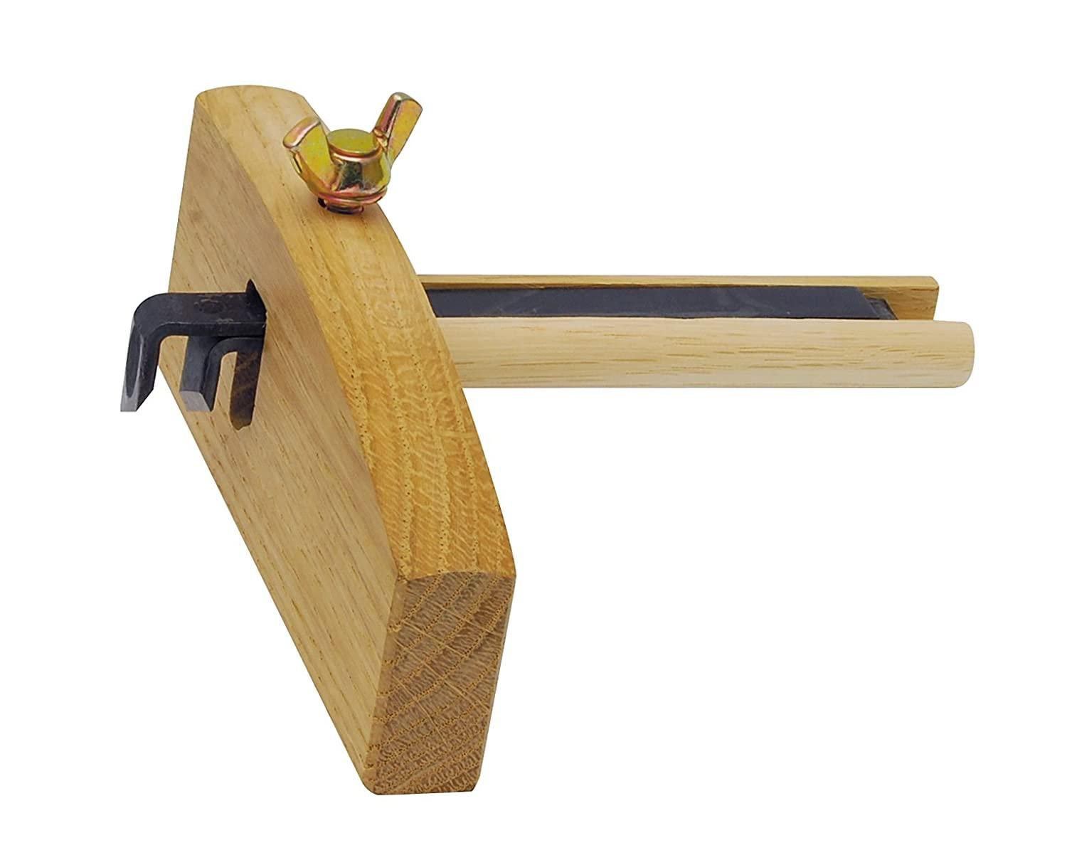 加工物の側面に沿った加工線のケガキに 穴の内側などのケガキに 同時に二本線が引ける二枚刃 材質 刃部:刃物用特殊鋼 台:ナラ材