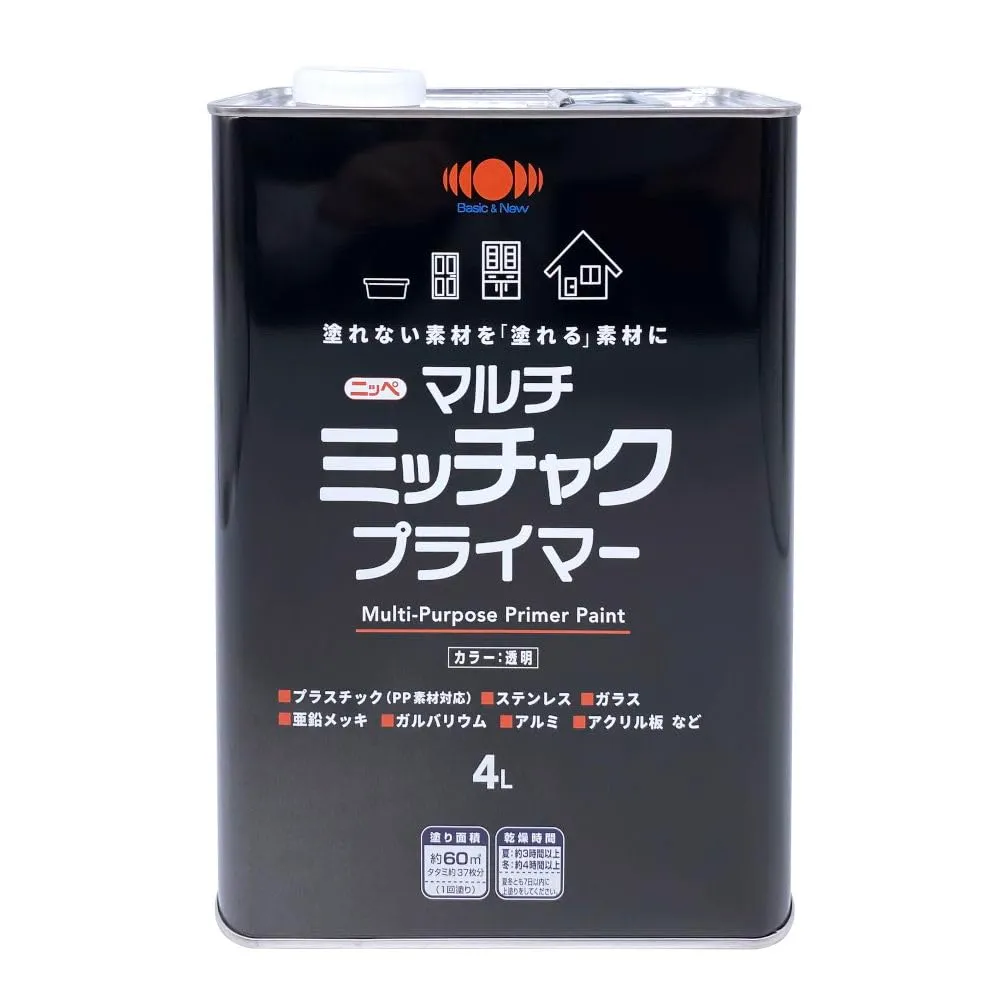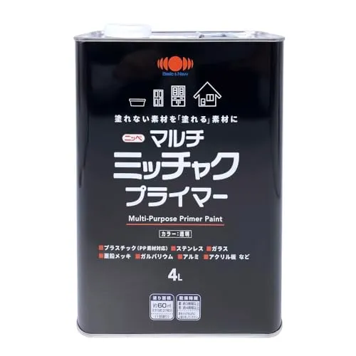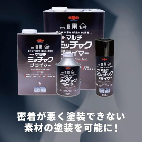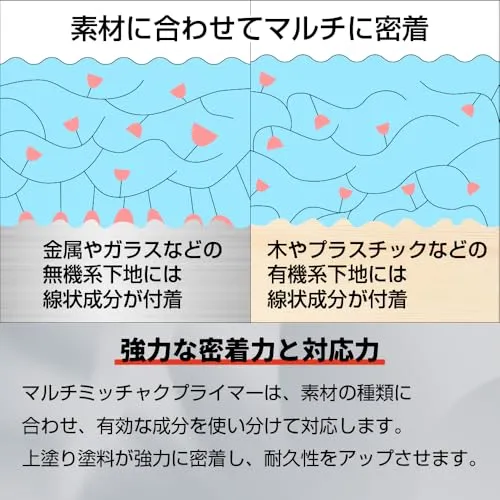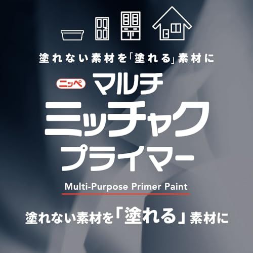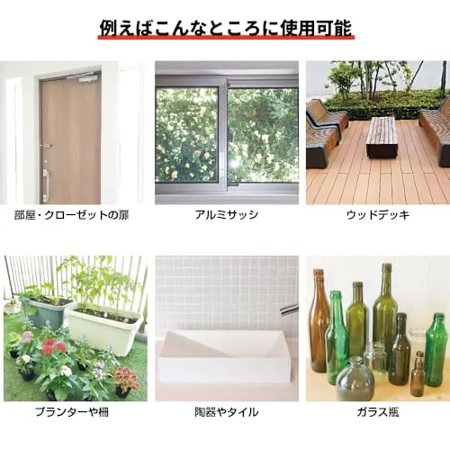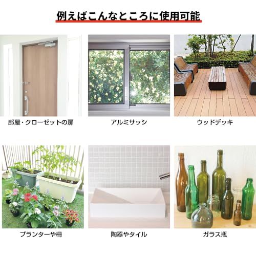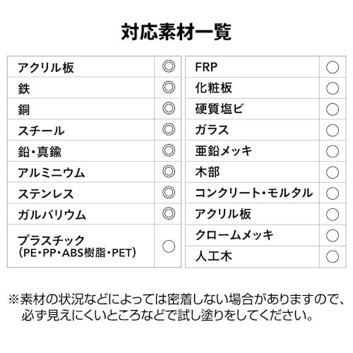 【用途】プラスチック(PE、PP、ABS樹脂、PET)、FRP、ガラス、アクリル板、亜鉛メッキ・アルミ・ステンレス・ガルバリウム・クロームメッキ・人工木など塗料の密着の悪い金属、鉄、銅、スチール、鉛・進駐、カラートタン、押出成形セメント板、サイディングボード、モルタル、ブロック、PC板、けい酸カルシウム板、ALC、住宅用化粧スレート屋根、GRC、化粧板、硬質塩ビ、木部、コンクリート・モルタルなどの幅広い素材。 ※素材の状況などによっては密着しない場合がありますので、必ず見えにくいところなどで試し塗りをしてください。