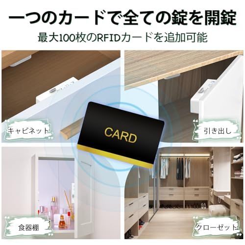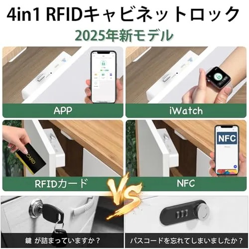 【4-in-1 スマートキャビネットロック】好きな方法で解錠!スマートアプリ制御、RFIDカード、NFC、Apple Watchに対応。鍵やパスワード不要、タッチ一つで解錠。