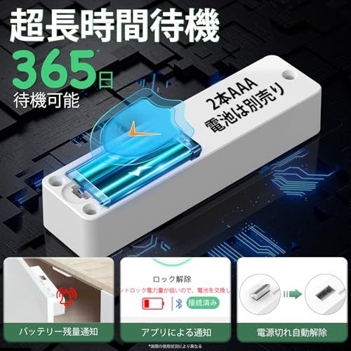 【バッテリー切れ心配なし】バッテリー残量警告と電力低下時自動解錠機能付き。電力が10%未満になるとロックが解除され、ロックアウトを防ぎます。2本のAA電池(別売り)で動作し、最大365日駆動、約6,000回の解錠に対応。ストレスなく安心なセキュリティを。