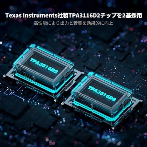 【優れた音質のTPA3116D2チップ】TPA3116D2はTexasInstrumentsのクラスdアンプです。広い電圧入力範囲、高効率、フィルター不要という特徴があります。その効率は92%以上に達する可能性があるため、長時間の高出力動作でも、THDが0.1%未満であることを保証します。