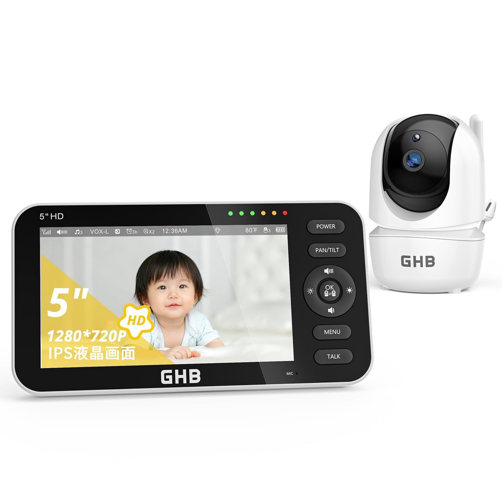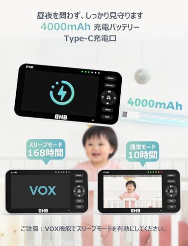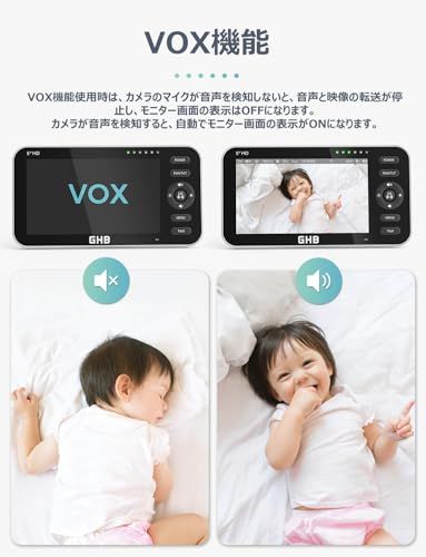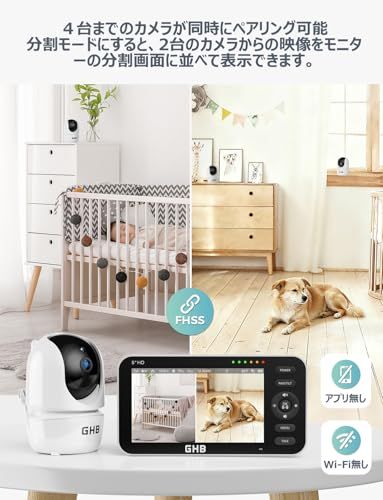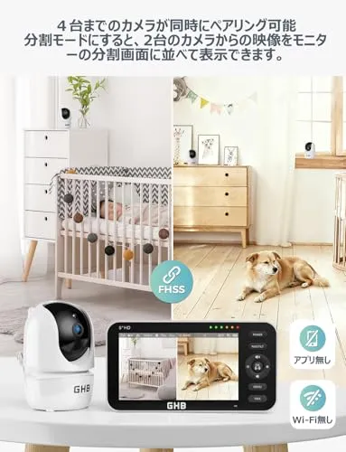 【大画面モニターと分割画面機能】5インチの大画面モニターで、赤ちゃんの表情をしっかり確認できます。さらに、分割画面機能を使えば、異なる部屋にいる2人のお子様を同時に同じ画面で見守ることができ、便利です(この機能を使用するには、2台以上のカメラが必要です)。