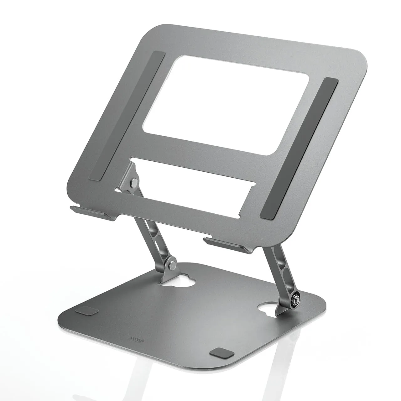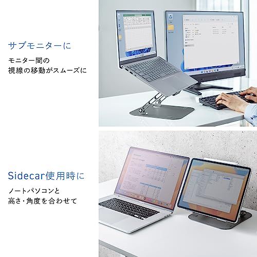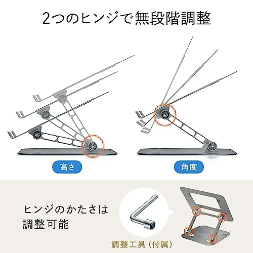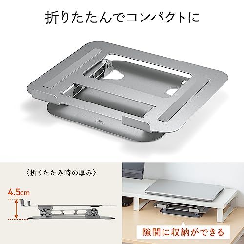 2つのヒンジを搭載し、無段階で自由に角度と高さを調整することができるので、使用環境に合わせて最適な角度で使用できます。また、折りたたんでコンパクトにできるので、省スペースに収納可能です。