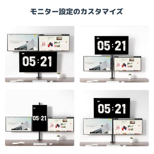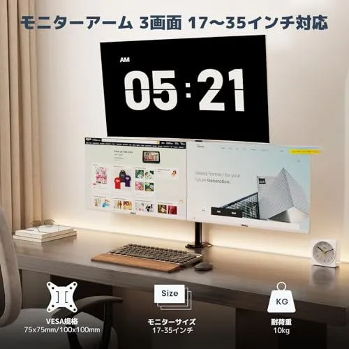 【3画面モニターアーム】3台モニターを同時に設置し、17インチから35インチまで、1モニター2kgから10kgまで/総重量30kgまでのモニターに対応、VESA 100x100mm/75x75mm。