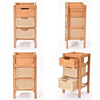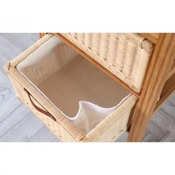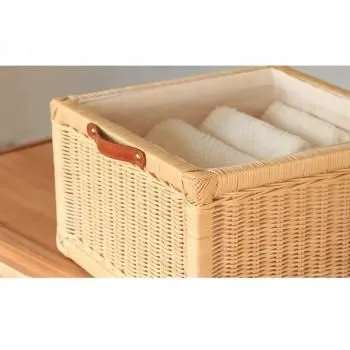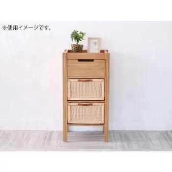 すっきりとした見た目ながらも無垢材ならではの気品が漂う収納チェスト。サンドブラスト加工をほどこしたチークの木肌は、自然素材家具ならではの、やわらかく手に馴染みやすい感触。引出しは手で編まれた温かみがそのまま伝わってくる、ラタン(籐)製内布付きのバスケット。ランドリーやリビングチェストとして、幅広い用途でお使いいただけます。